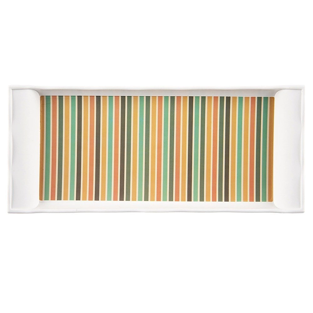 Praktyczny prostokątny tacek jest idealny do serwowania kawy, herbaty, ciast i drobnych przekąsek. Dzięki podwyższonym krawędziom i solidnej konstrukcji z wysokiej jakości plastiku zapewnia bezpieczne przenoszenie bez rozlewania. Kolorowy, paskowany dekor świetnie prezentuje się w nowoczesnej i klasycznej kuchni.
