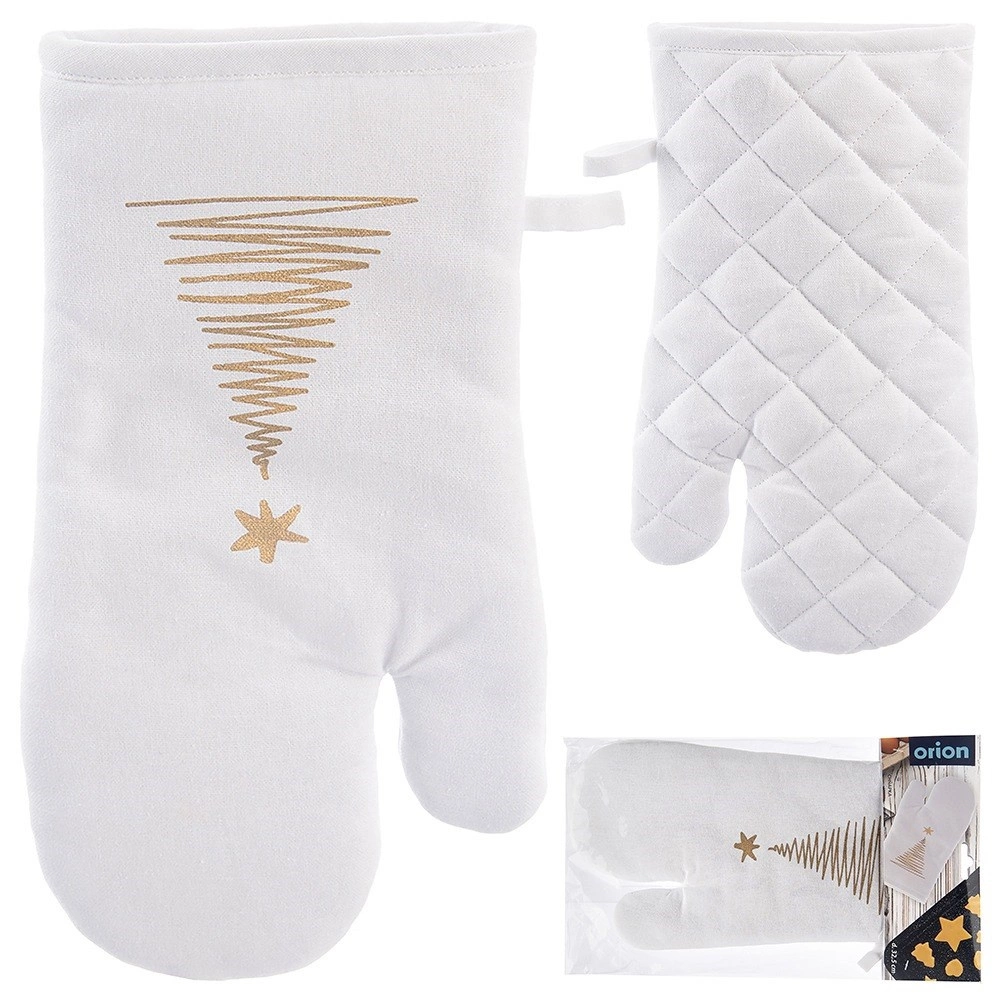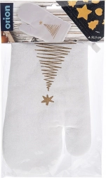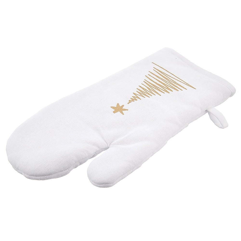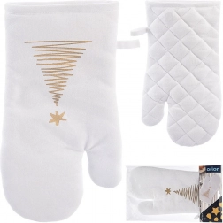 Praktyczna i elegancka rękawica w białym kolorze ze złotym motywem choinki stanie się niezastąpionym pomocnikiem w każdej kuchni. Wysokiej jakości bawełna z miękkim wypełnieniem zapewnia skuteczną izolację termiczną i pewny chwyt gorących blach oraz garnków.