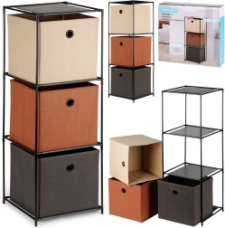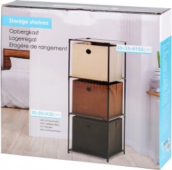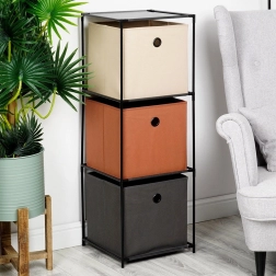 Ten wąski regał o wymiarach 34,5 × 34,5 × 100 cm łączy wytrzymałą czarną metalową ramę i trzy tekstylne boxy w kolorach beżowy, brązowy i antracyt. Każdy box ma metalowe oczko do łatwej obsługi i jest składany, więc nie zajmuje miejsca, gdy nie jest używany. Idealne rozwiązanie do przejrzystej segregacji i przechowywania.
