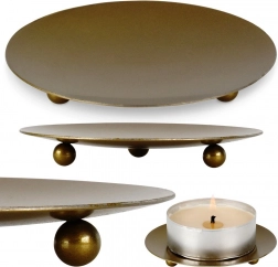 Elegancka metalowa podstawka pod świece o średnicy 8,5 cm w matowym, złotym kolorze. Dzięki trzem kulistym nóżkom jest stabilna, chroni powierzchnie przed ciepłem i woskiem, a świecom zapewnia stylową ekspozycję. Minimalistyczny design pasuje do nowoczesnych wnętrz i sprawdzi się także jako dekoracyjna miseczka na drobiazgi lub biżuterię.