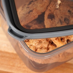 Pokrywka dokładnie przylega i pomaga utrzymać produkty dłużej świeże. Pojemnik wykonany jest z wysokiej jakości, wytrzymałego plastiku w nowoczesnym, szaro-przezroczystym kolorze, jest bezpieczny dla zdrowia i można myć go w zmywarce. Przy zakupie kilku sztuk można je łatwo sztaplować, oszczędzając miejsce w szafkach.