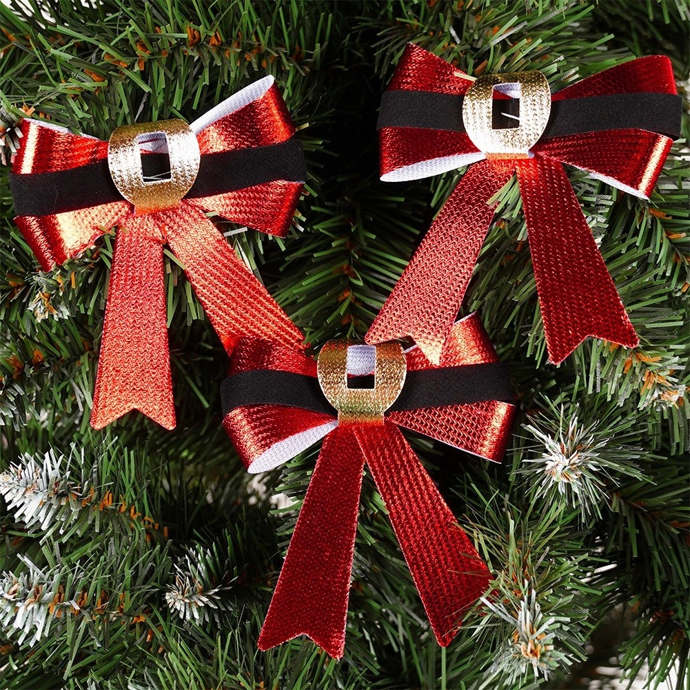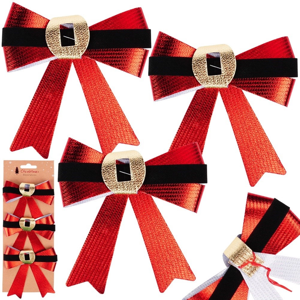 Czerwone, satynowe pętle z czarnym paskiem i złotym detalem „klamry” tworzą efekt paska Świętego Mikołaja – stylowy akcent dla choinki i wnętrza.