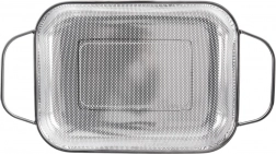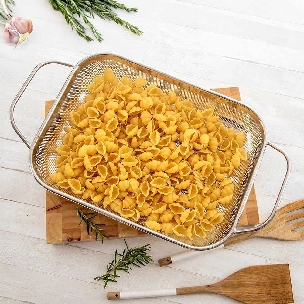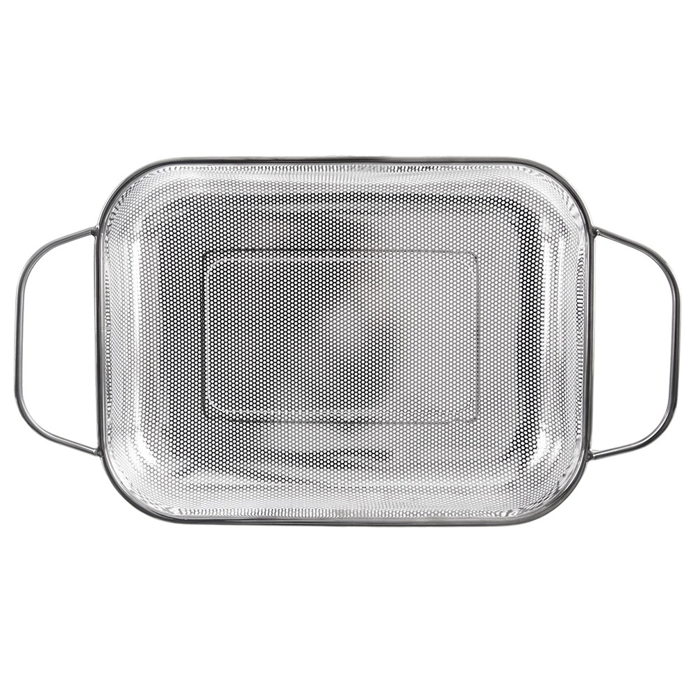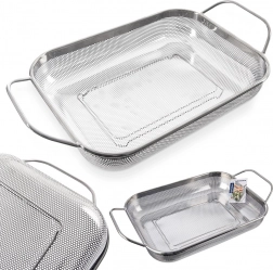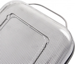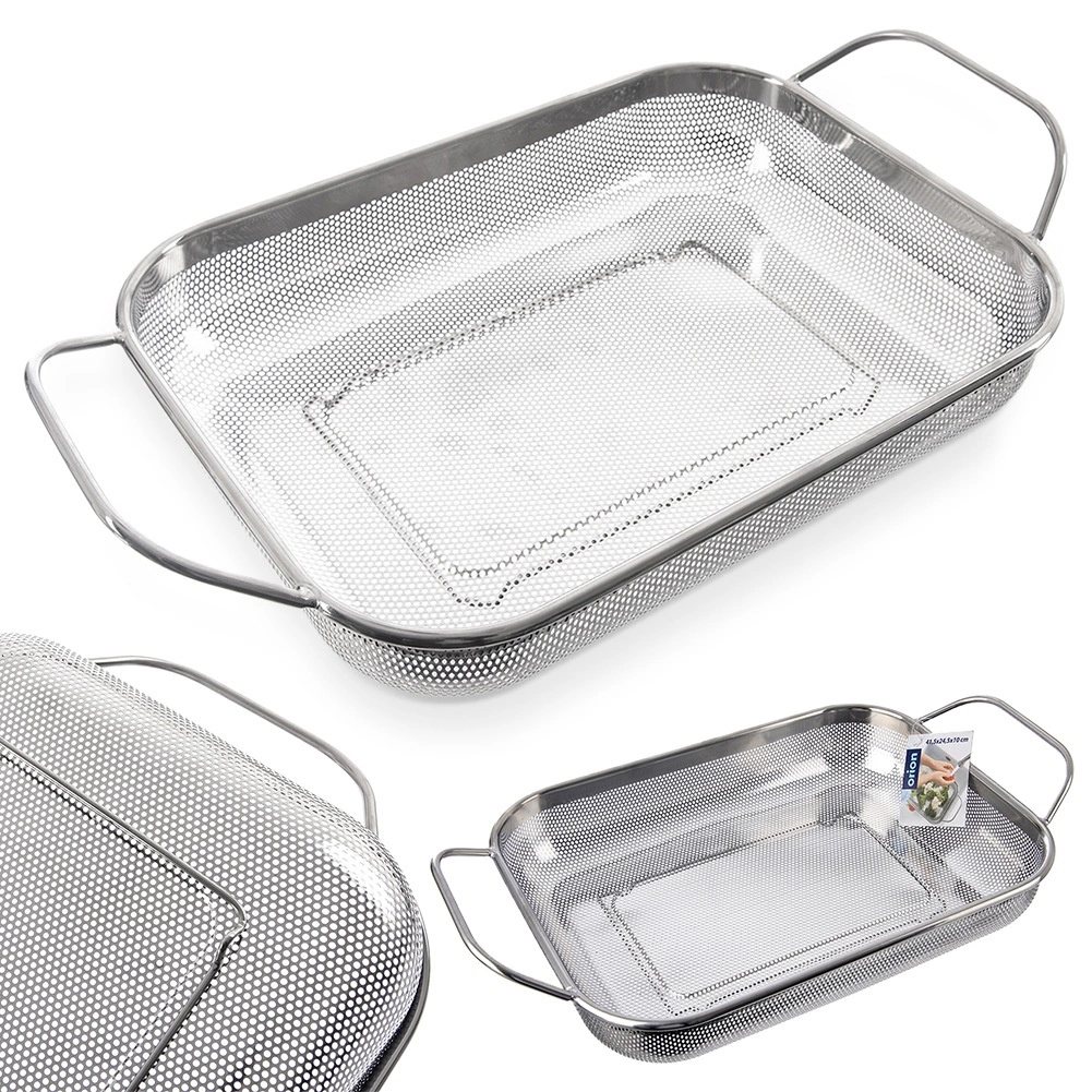 Praktyczny prostokątny cedzak/ociekacz ze stali nierdzewnej ze stabilnymi nóżkami i dwoma uchwytami dla wygodnego przenoszenia. Idealny do mycia owoców i warzyw, odcedzania makaronu lub ryżu, a także jako kosz na grill do warzyw, ryb czy mniejszych kawałków mięsa. Dzięki drobnej perforacji szybko odprowadza wodę, jest odporny na wysokie temperatury i można go myć w zmywarce.