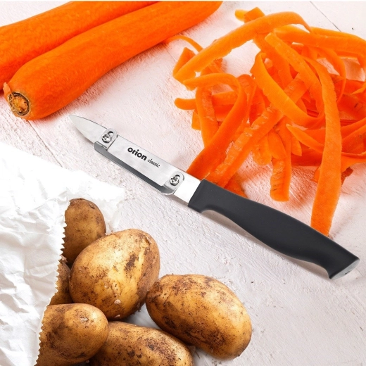 Praktyczny mały nóż kuchenny z wbudowaną pionową obieraczką do szybkiego obierania owoców i warzyw. Łączy ostrze ze stali nierdzewnej z ergonomiczną, antypoślizgową rękojeścią, oferuje regulację głębokości skrawania obieraczki oraz łatwą pielęgnację w zmywarce. Idealny do precyzyjnych prac, obierania ziemniaków, marchwi i jabłek.