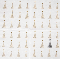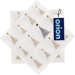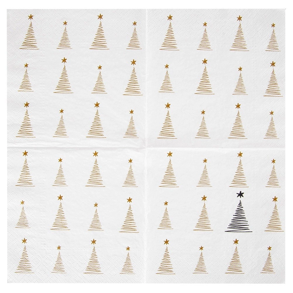 Dodaj swojej zastawie świąteczny nastrój dzięki papierowym serwetkom w białym kolorze ze złotym motywem choinek. Dzięki 3-warstwowej strukturze są przyjemne w dotyku, wytrzymałe i niezawodnie chłoną płyny. Po rozłożeniu mają wymiary 33 × 33 cm (przed rozłożeniem 16,5 × 16,5 cm), więc sprawdzą się zarówno do dania głównego, jak i deseru.