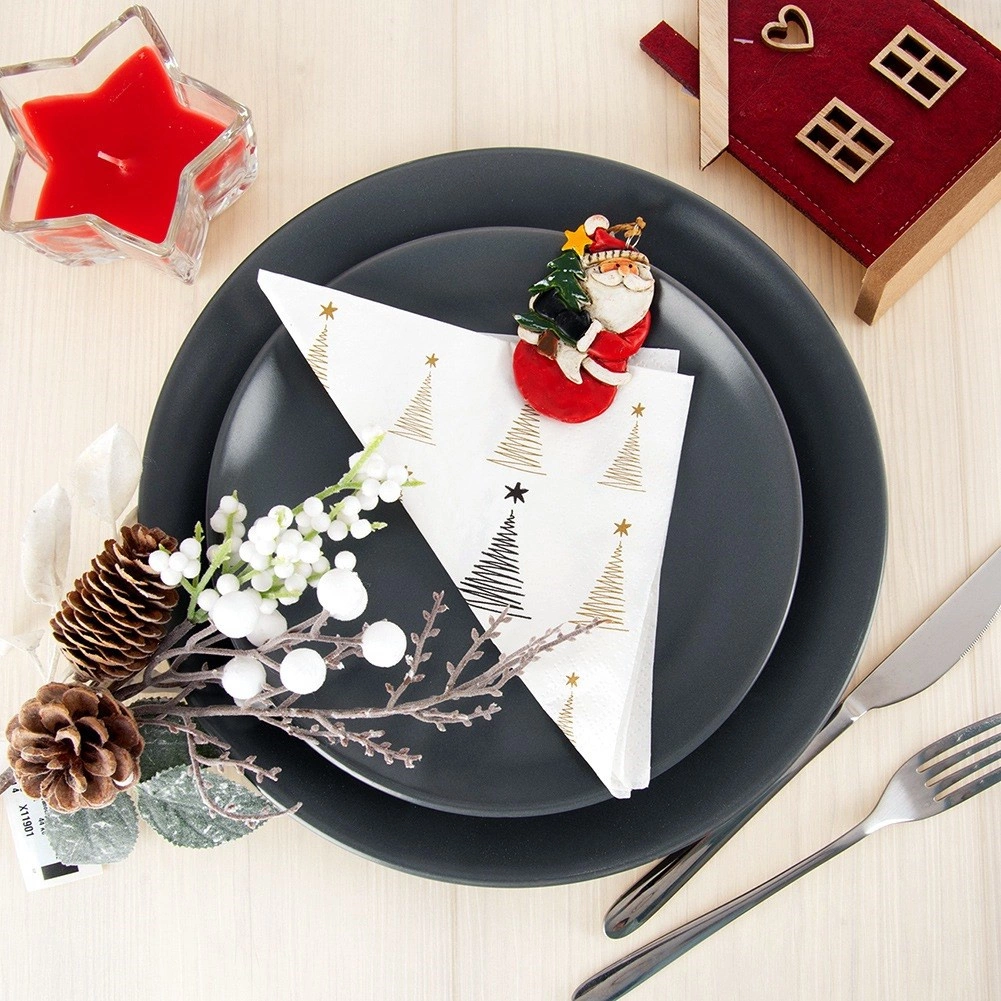 - Świąteczny design – białe serwetki ze złotym motywem choinek tworzą przytulną atmosferę.