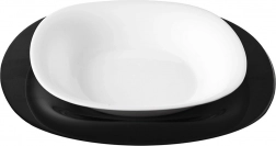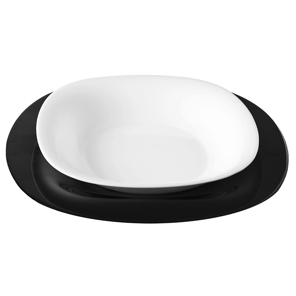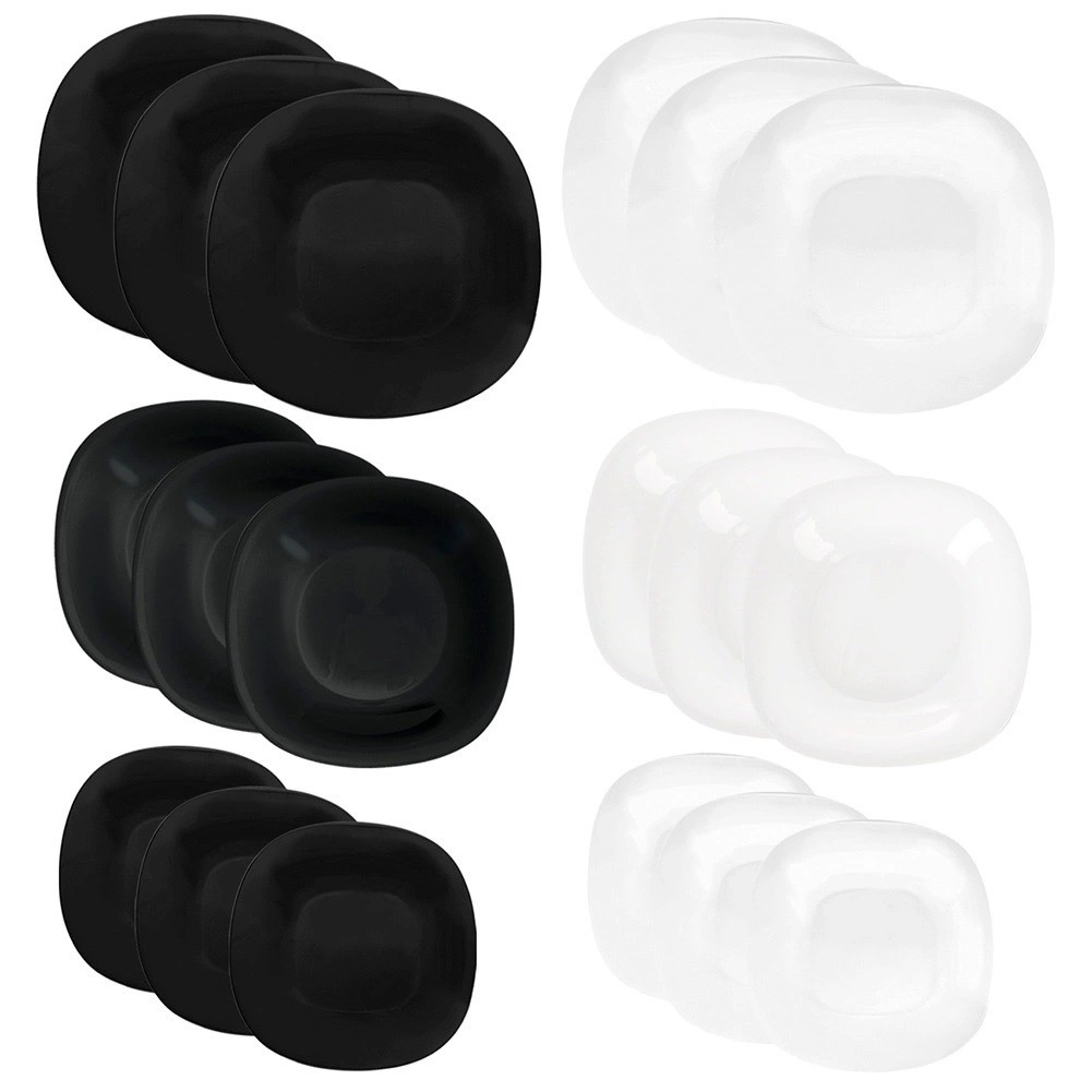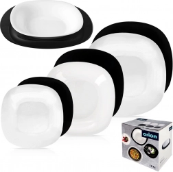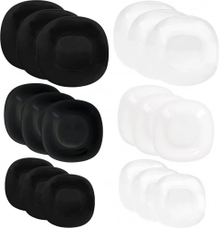 W zestawie znajduje się wszystko do kompletnego nakrycia stołu: 6 talerzy deserowych, 6 talerzy głębokich oraz 6 talerzy płytkich w harmonijnym połączeniu bieli i czerni. Zaokrąglone kwadratowe linie dodają nowoczesnego charakteru i jednocześnie pozwalają oszczędzać miejsce przy sztaplowaniu.