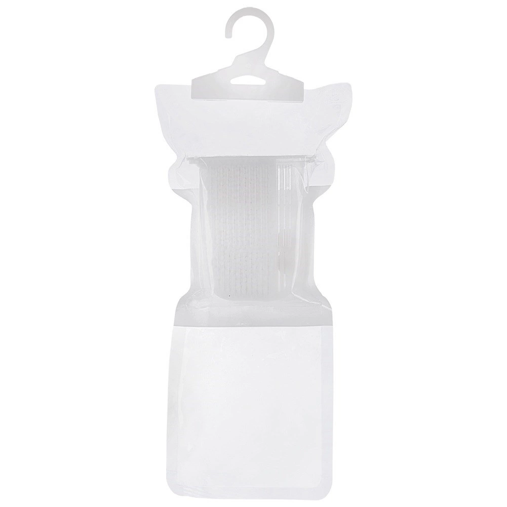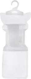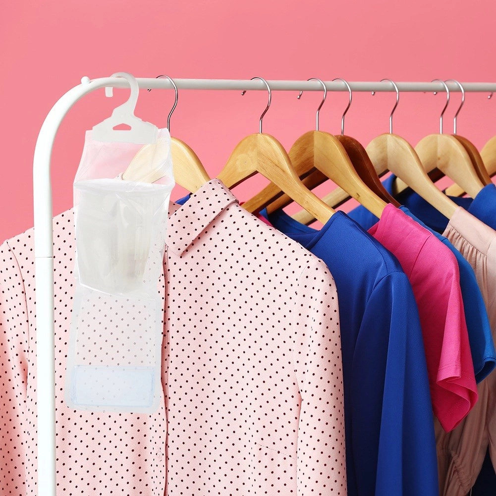 Dzięki praktycznemu haczykowi łatwo zawiesisz go na drążku garderobianym lub haczyku na ścianie. Absorpcyjny granulat z CaCl₂ wiąże wilgoć z powietrza i przekształca ją w wodę, która gromadzi się w dolnej części saszetki. Po napełnieniu produkt należy wymienić.
