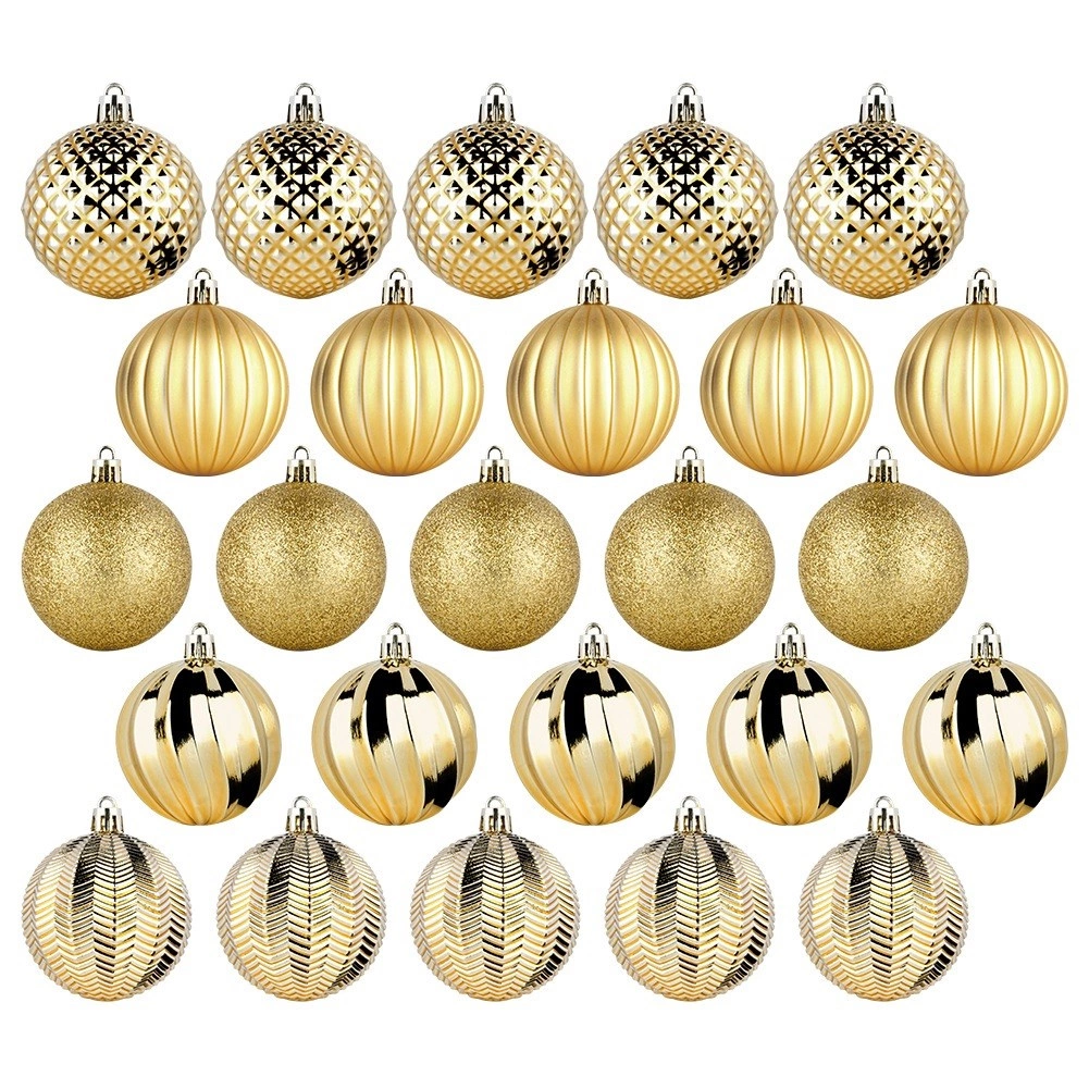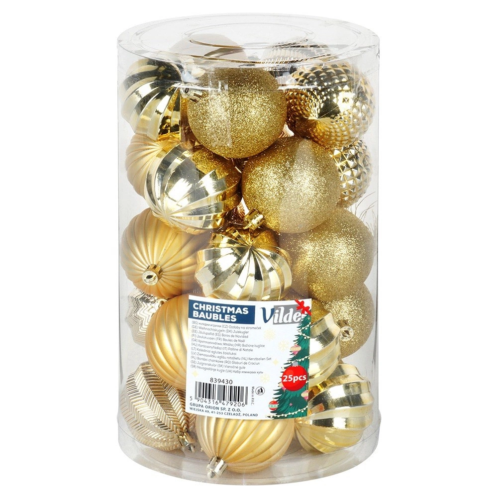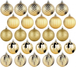 Elegancki zestaw 25 sztuk złotych ozdób choinkowych o średnicy 6 cm z nietłukącego materiału. Łączy powierzchnie błyszczące, matowe, brokatowe i tłoczone, tworząc bogaty efekt i umożliwiając łatwe dopasowanie do każdej dekoracji. Bezpieczne dla dzieci i zwierząt domowych, idealne na choinkę, wieńce i świąteczne aranżacje. Sznureczki do zawieszenia w zestawie.