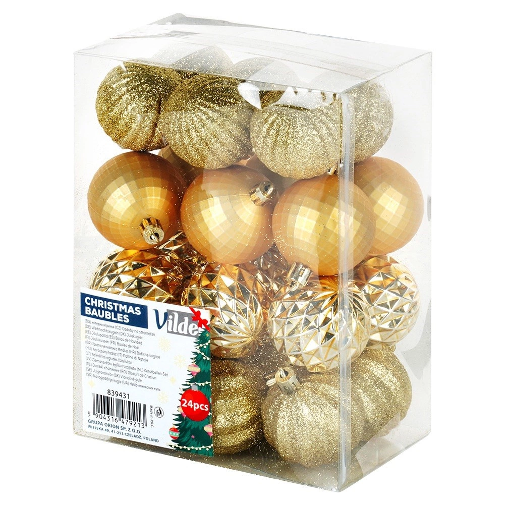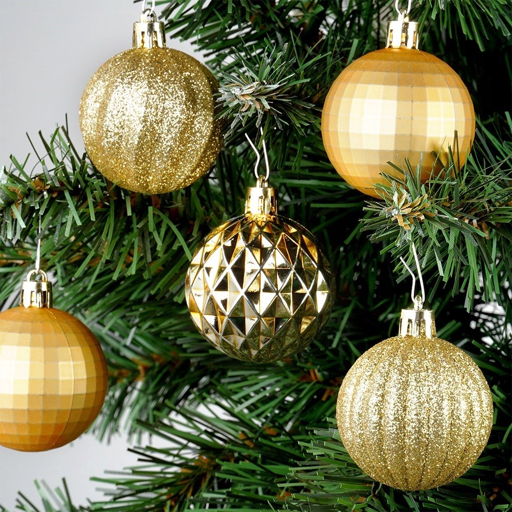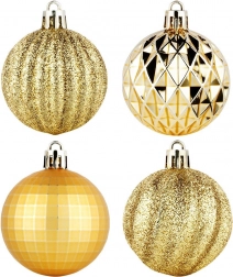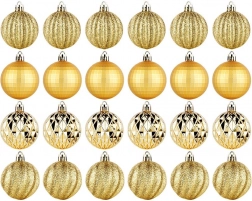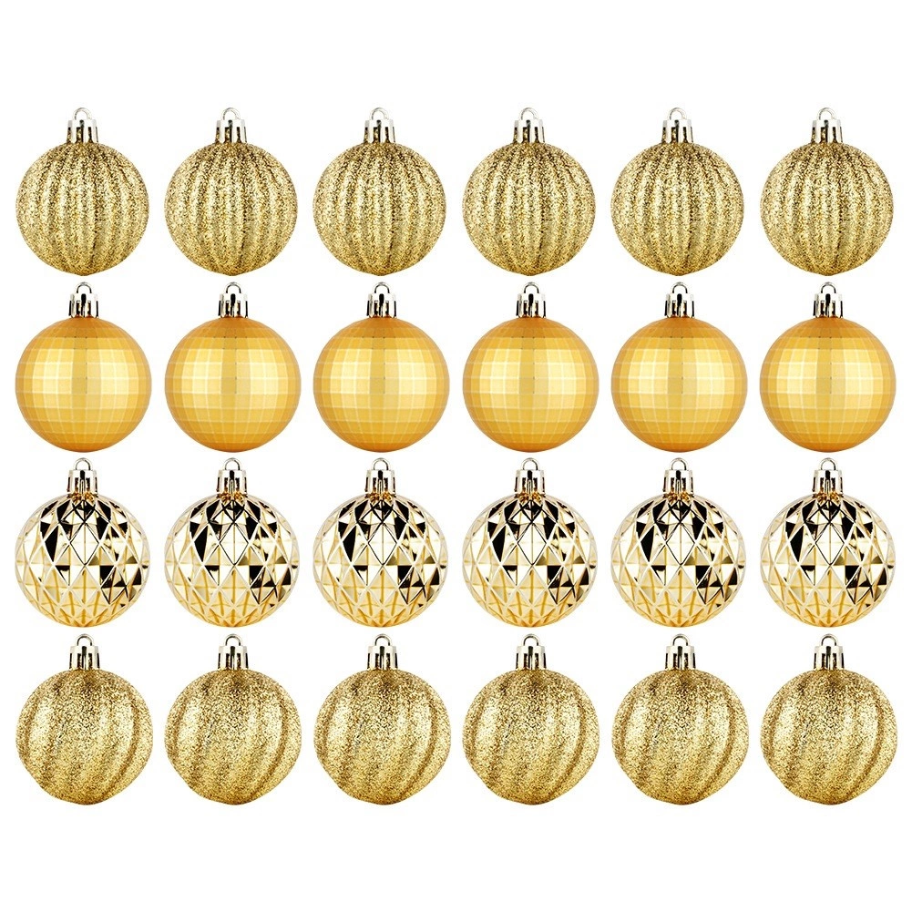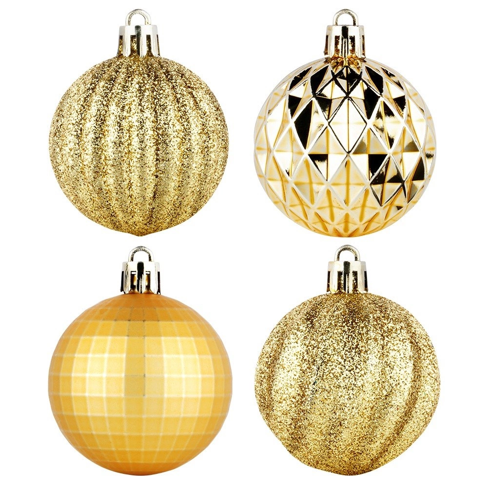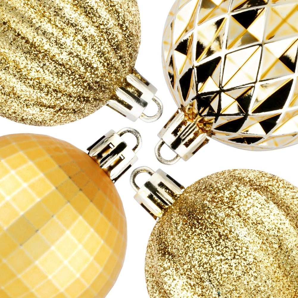 Elegancki zestaw 24 złotych bombek choinkowych o średnicy 5 cm w różnych wykończeniach – błyszczących, matowych, brokatowych i strukturalnych. Wykonane z nierozbijalnego plastiku dla większego bezpieczeństwa w domu z dziećmi i zwierzętami, z dołączonymi sznureczkami do łatwego zawieszania.