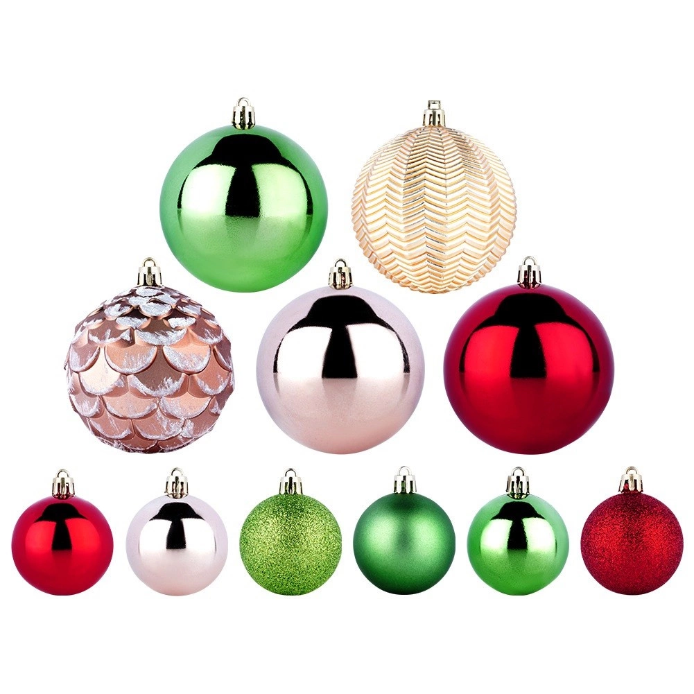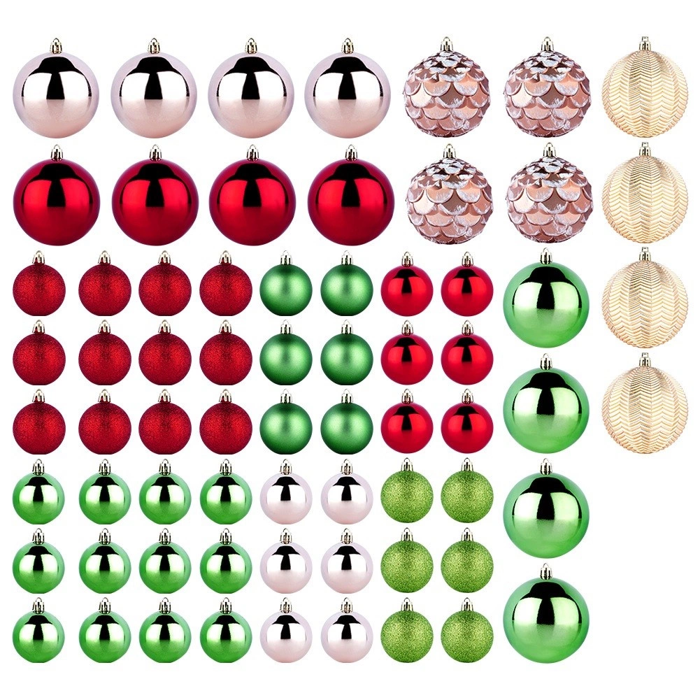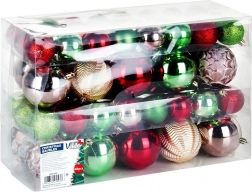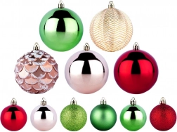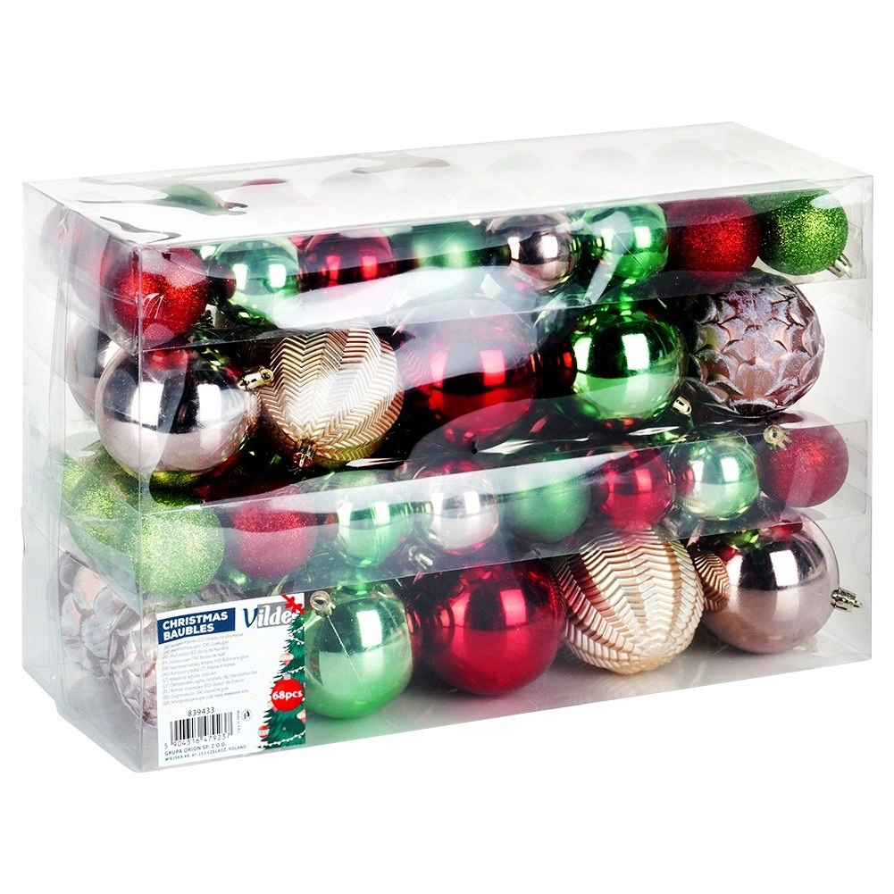 W opakowaniu znajdziesz 20 bombek o średnicy 8 cm (błyszczące czerwone, tłoczone złote, błyszczące i tłoczone jasnoróżowe, błyszczące zielone) oraz 48 sztuk o średnicy 5 cm (błyszczące czerwone 6×, brokatowe zielone 6×, błyszczące jasnoróżowe 6×, brokatowe czerwone 12×, błyszczące zielone 12×, matowe zielone 6×). Każda ozdoba ma metalowe oczko, a w zestawie są sznureczki do natychmiastowego dekorowania.