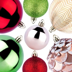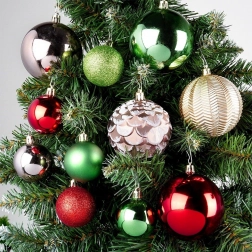 Połączenie bombek 8 cm i 5 cm w wykończeniach błyszczącym, matowym, brokatowym i tłoczonym tworzy dynamiczną i elegancką dekorację świąteczną.