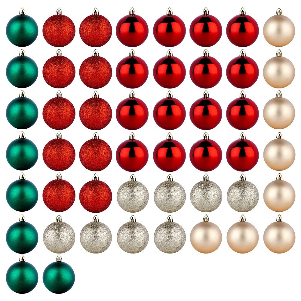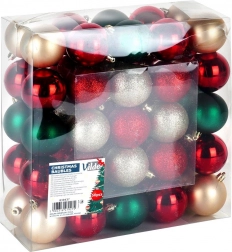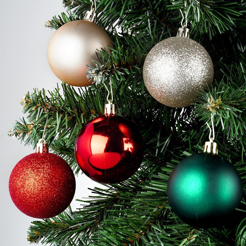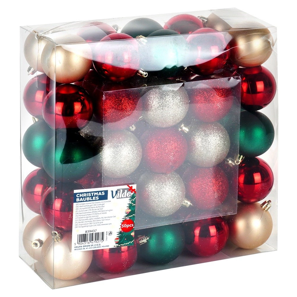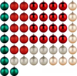 Stylowy zestaw 50 nietłukących bombek choinkowych o średnicy 6 cm w kolorach czerwonym, zielonym i szampańskim, w wykończeniu błyszczącym, matowym i brokatowym. Trwałe plastikowe ozdoby z metalowymi czapeczkami i sznureczkami do zawieszenia dodają choince klasycznego blasku i tworzą magiczną, świąteczną atmosferę – bezpieczny wybór do domów z dziećmi i zwierzętami.