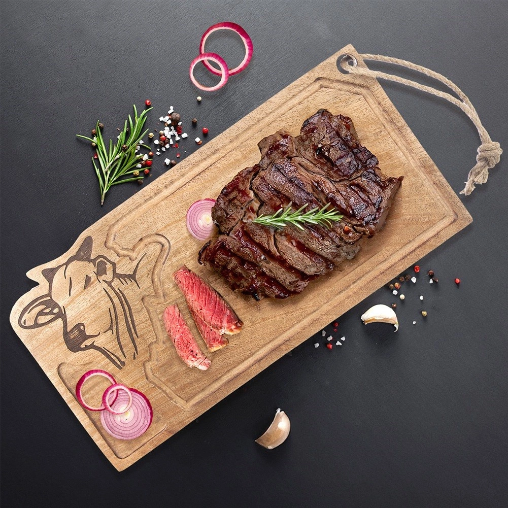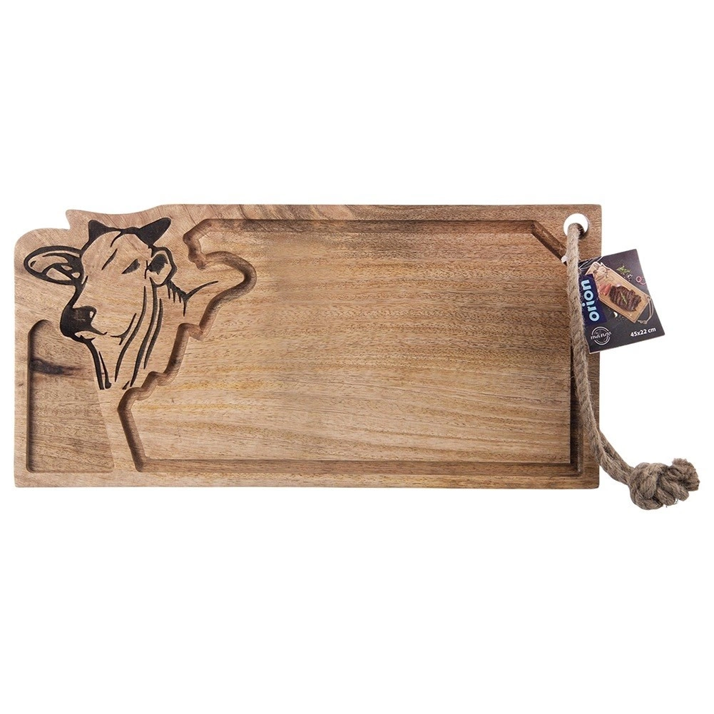 Odkryj wszechstronną drewnianą deskę z drewna mango, która wyróżnia się wytrzymałością, naturalną odpornością i pięknym rysunkiem słojów. Dzięki praktycznemu rowkowi na soki deska utrzyma kuchenny blat w czystości podczas krojenia mięsa, owoców i warzyw. Grawerowana głowa byka oraz sznurek do zawieszania podkreślają jej dekoracyjny i funkcjonalny charakter.