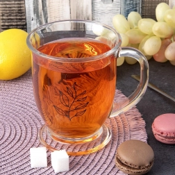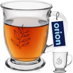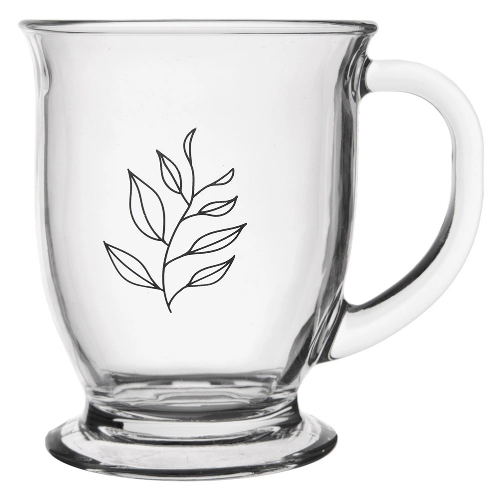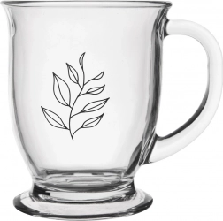 Praktyczny szklany kubek o pojemności 450 ml do codziennego picia herbaty, kawy i kakao. Wykonany z wysokiej jakości grubego szkła z wytrzymałym uchem, ma stabilną podstawę i motyw liścia, który doda elegancji każdemu nakryciu stołu. Odpowiedni do zmywarki i mikrofalówki.