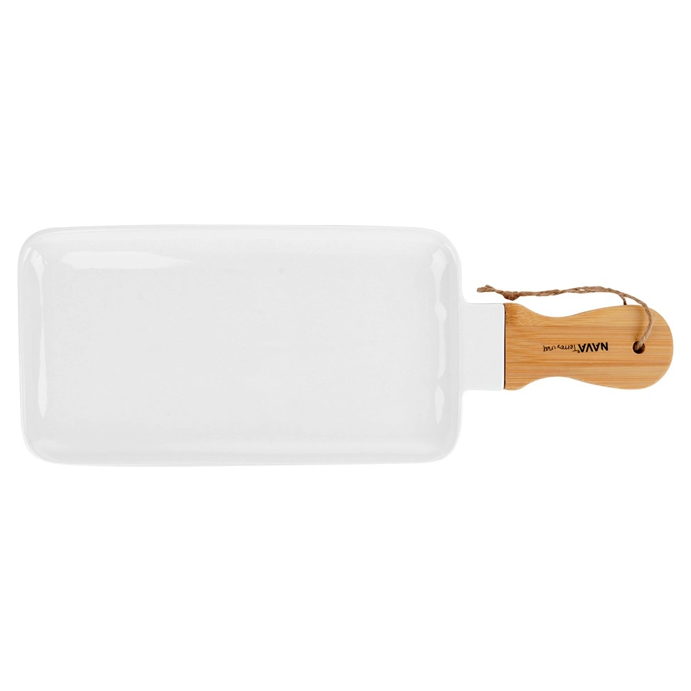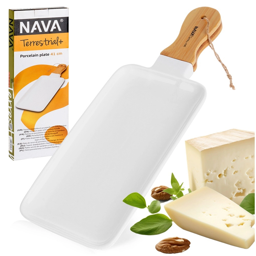 Porcelanowy talerz do serwowania NAVA TERRESTRIAL łączy ponadczasową biel porcelany z ciepłem bambusa. Gładka, szkliwiona powierzchnia jest idealna do stylowego serwowania tapas, serów, deserów lub owoców, a ergonomiczny uchwyt z oczkiem i sznurkiem umożliwia łatwe przenoszenie i zawieszanie na haczyku.