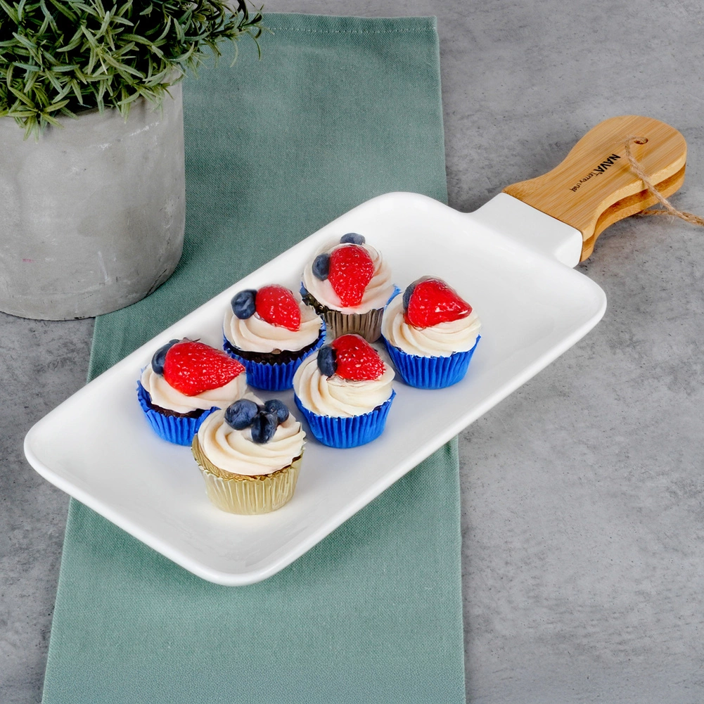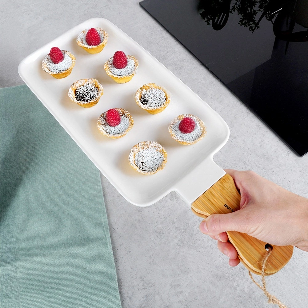 Elegancki talerz do serwowania z białej porcelany z bambusowym uchwytem dla wygodnego przenoszenia i zawieszania. Idealny na przystawki, desery i dania główne, świetnie pasuje do nowoczesnej i klasycznej kuchni. Wytrzymałe wykonanie, gładka powierzchnia oraz stylowe połączenie drewna i porcelany dla efektownego serwowania w domu i gastronomii.