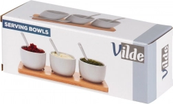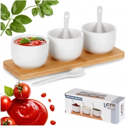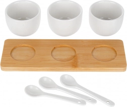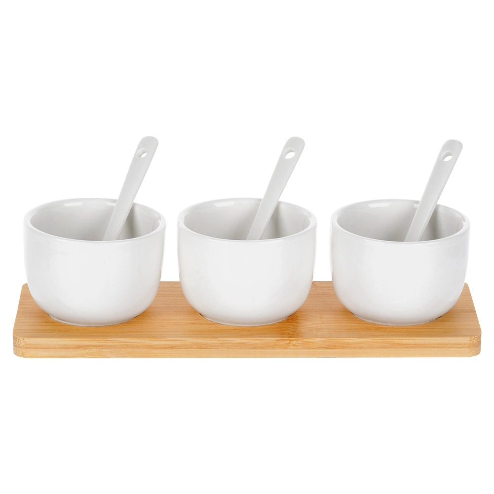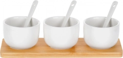 Ten 7‑elementowy zestaw łączy minimalistyczny design i praktyczne detale do codziennego stołowania oraz uroczystych okazji. Trzy gładkie białe ceramiczne miseczki (90 ml) są umieszczone w precyzyjnie frezowanych otworach bambusowej tacy, dzięki czemu nie przemieszczają się podczas przenoszenia. W komplecie znajdują się także dopasowane ceramiczne łyżeczki do wygodnego nakładania.
