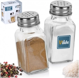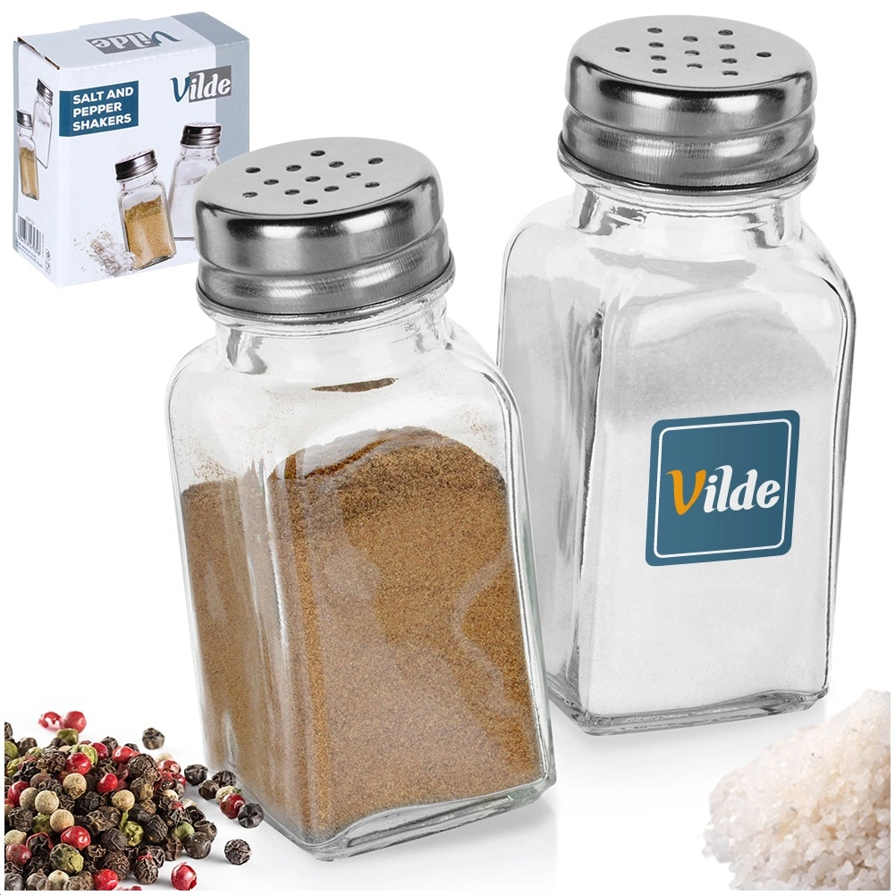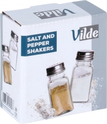 Praktyczny zestaw dwóch pojemników – solniczka i pieprzniczka z przezroczystego, grubego szkła z metalową nakrętką z otworami dozującymi. Każdy pojemnik ma pojemność 80 ml i wymiary 4 × 4 × 9,5 cm. Idealne do codziennego użytku w domu i gastronomii, o klasycznym designie, który pasuje do każdego nakrycia stołu.