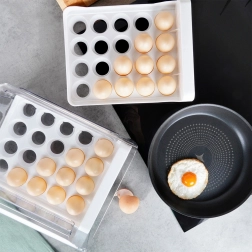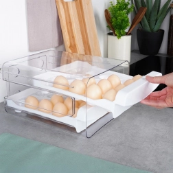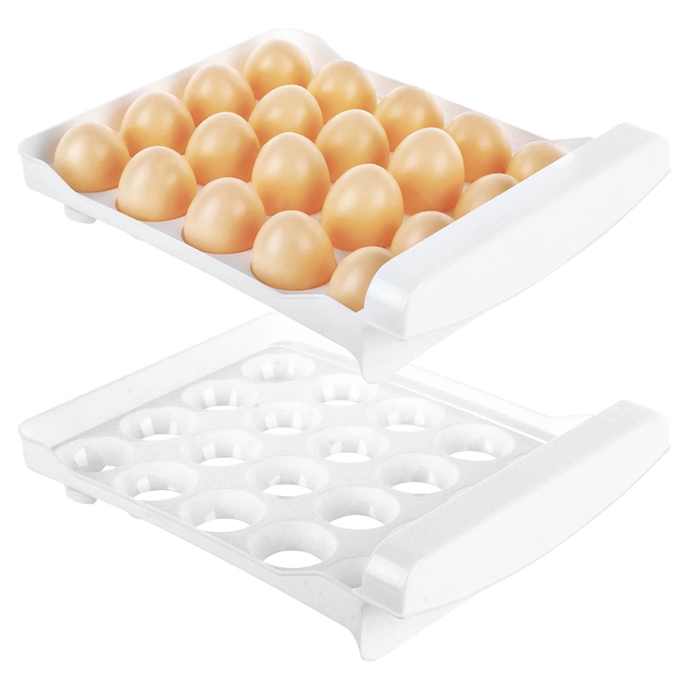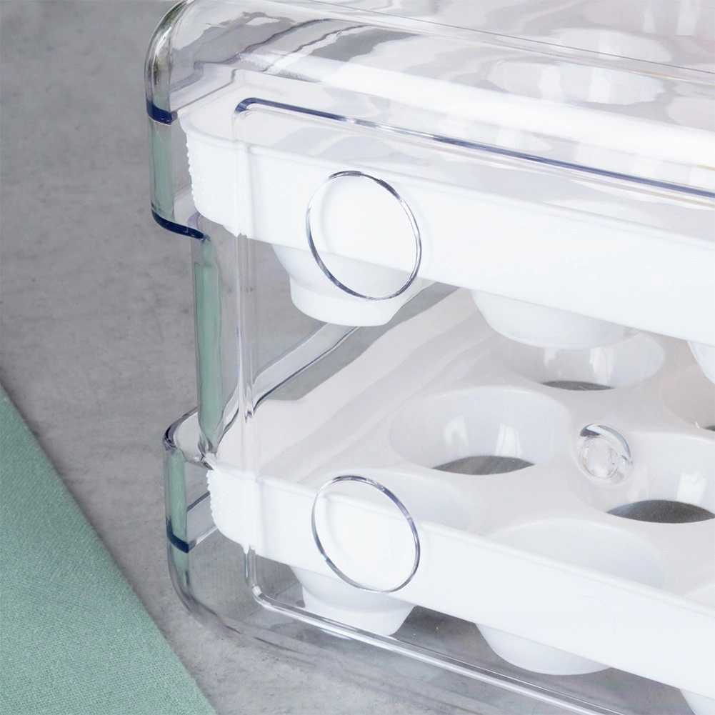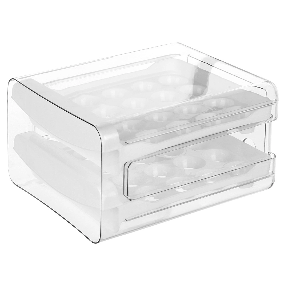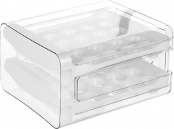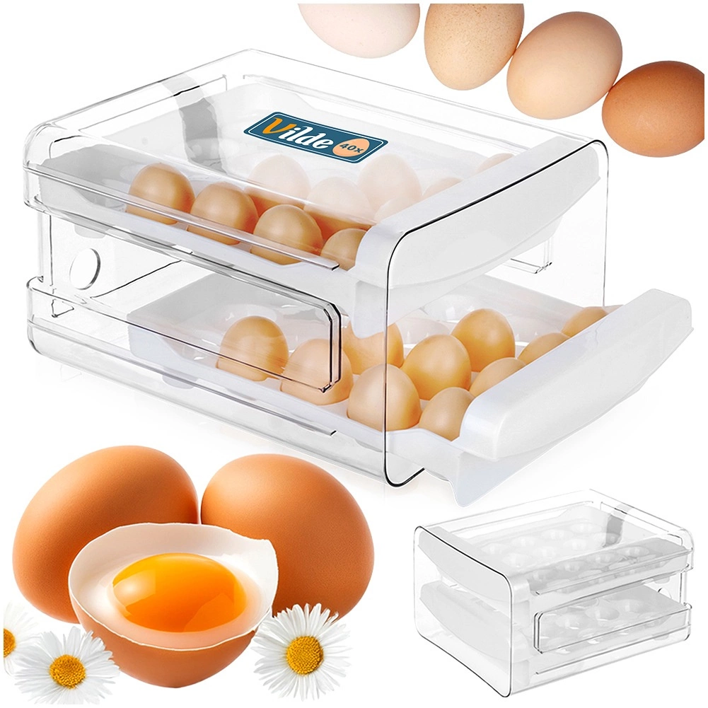 Praktyczny dwupoziomowy organizer na jajka mieści aż 40 jaj i utrzymuje je przejrzyście uporządkowane, chronione przed uszkodzeniami i zawsze pod ręką. Dzięki wysuwanym szufladom wyjmowanie i uzupełnianie jest łatwe, a przezroczyste ścianki umożliwiają natychmiastową kontrolę zapasów. Kompaktowe wymiary oszczędzają miejsce w lodówce.