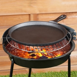 Dzięki odporności na wysokie temperatury świetnie sprawdza się do smażenia i pieczenia na kuchence, w piekarniku, na grillu i bezpośrednio nad ogniem. Patelnia nie ma żadnej chemicznej warstwy nieprzywierającej – naturalną nieprzywieralność tworzy właściwa pielęgnacja i seasoning.