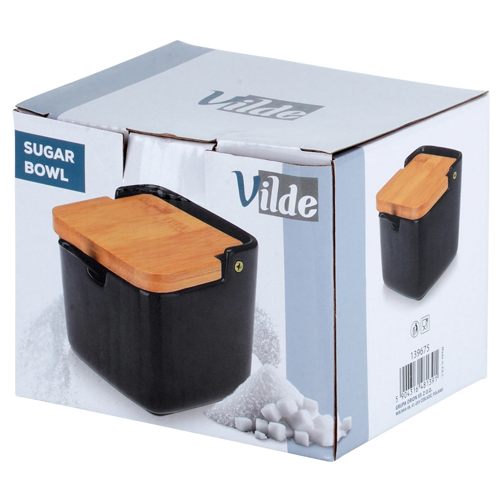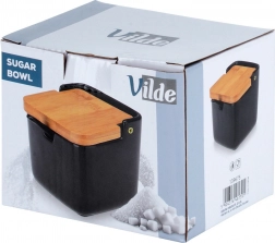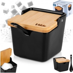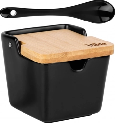 Ta stylowa cukiernica o minimalistycznym designie świetnie uzupełni każdą kuchnię i jadalnię. Matowa czarna ceramika w połączeniu z naturalnym bambusem prezentuje się elegancko, a jednocześnie jest bardzo praktyczna do codziennego użytku. Dzięki odchylanej pokrywce i wycięciu na łyżeczkę cukier lub sól masz zawsze pod ręką, a jednocześnie są chronione.