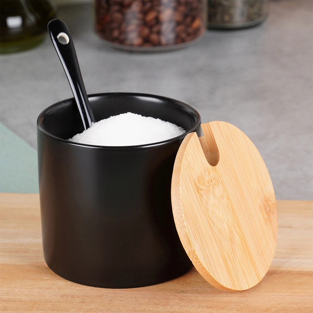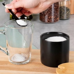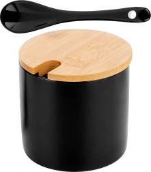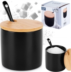Elegancka czarna cukiernica z bambusową pokrywką i zintegrowanym wycięciem na łyżeczkę dla łatwego dozowania. Idealna do cukru, soli i przypraw, o pojemności 250 ml i wymiarach 8,5 × 8 cm. W zestawie 13‑centymetrowa ceramiczna łyżeczka. Wytrzymała ceramika, wygodne przechowywanie i nowoczesny design doskonale uzupełnią każdą kuchnię i kawiarnię.