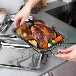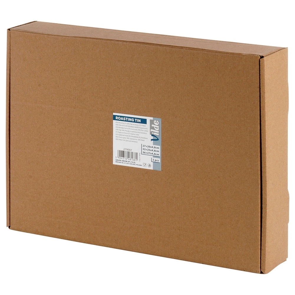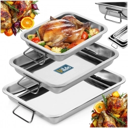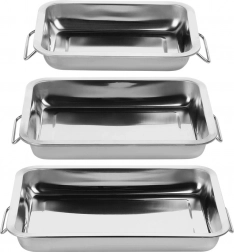 Praktyczny zestaw trzech prostokątnych brytfann z wysokiej jakości stali nierdzewnej do pieczenia mięsa, warzyw i deserów. Dzięki różnym rozmiarom oraz składanym uchwytom łatwo przygotujesz i przeniesiesz potrawy z piekarnika na stół. Gładka powierzchnia zapewnia wygodne czyszczenie, a solidne wykonanie wytrzymuje codzienne użytkowanie. Możliwość mycia w zmywarce oszczędza czas.