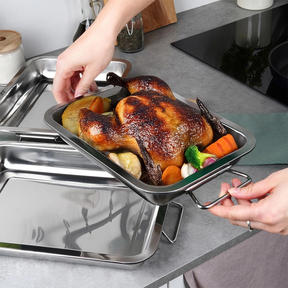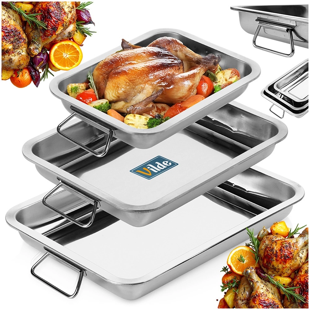 Zestaw trzech brytfann ze stali nierdzewnej w różnych rozmiarach jest idealny do pieczenia rodzinnego oraz do gastronomii. Grube ścianki i wysokiej jakości stal nierdzewna gwarantują równomierne rozprowadzanie ciepła i trwałość. Składane boczne uchwyty umożliwiają bezpieczne przenoszenie i jednocześnie oszczędzają miejsce podczas przechowywania.
