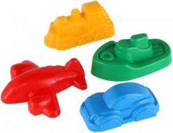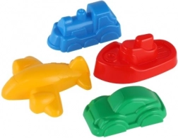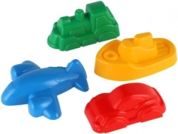 Pociąg, statek, samolot i auto w żywych kolorach zachęcają dzieci do tworzenia i zabawy w piasku oraz nad wodą.
