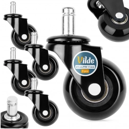Montaż zajmuje chwilę — wystarczy wysunąć stare kółka i wsunąć nowe w pięcioramienną podstawę. Standardowy trzpień 11 mm gwarantuje szeroką kompatybilność z większością krzeseł biurowych (nieodpowiednie do krzeseł IKEA). Idealne do drewna, laminatu, płytek i winylu.