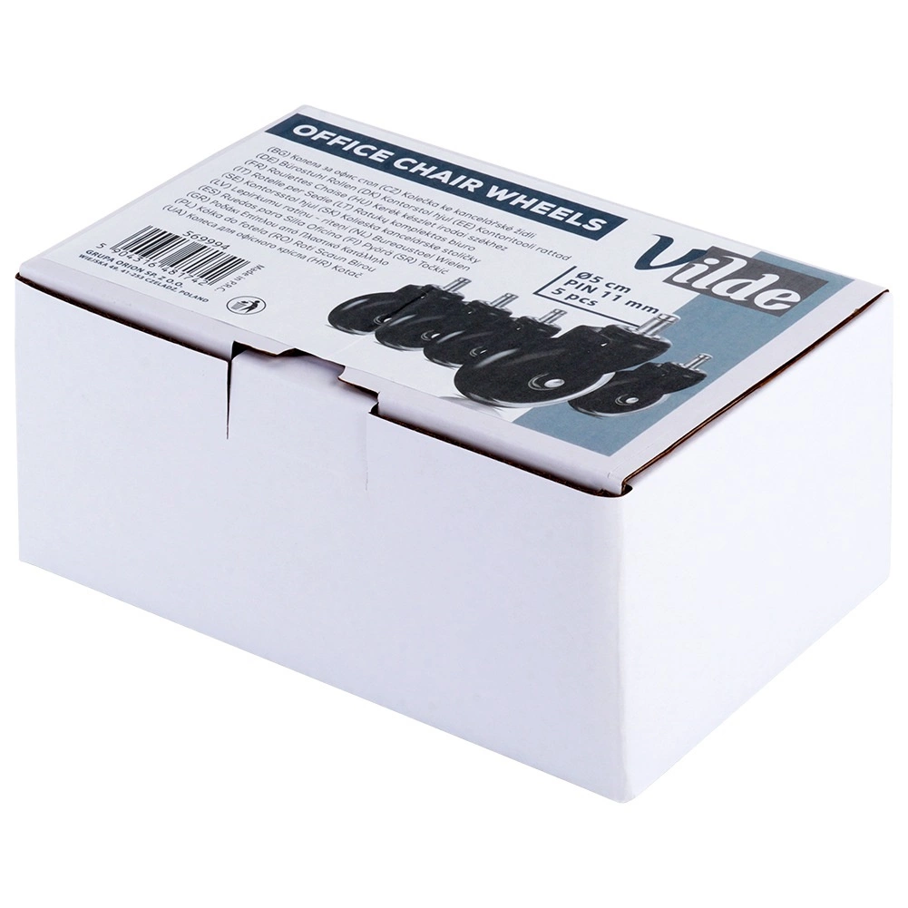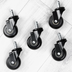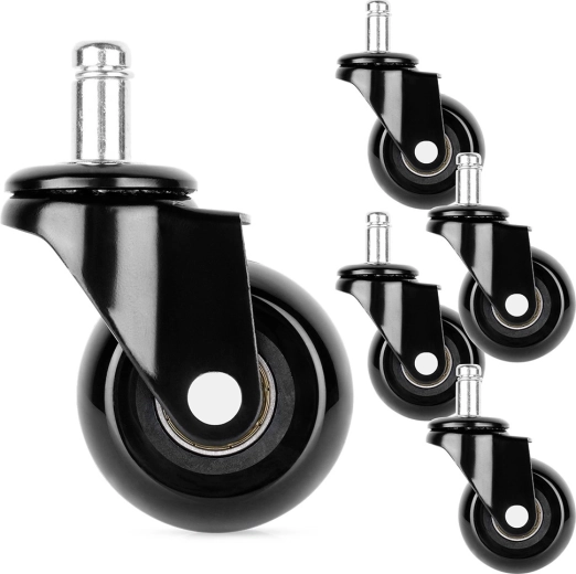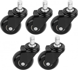 Zapasowy zestaw pięciu kółek do krzeseł biurowych z łatwym montażem bez użycia narzędzi. Gumowe kółka zapewniają cichy i płynny przejazd, chronią podłogę przed zarysowaniami i mają uniwersalny trzpień 11 mm. Odpowiednie do większości krzeseł, idealne na twarde podłogi.
