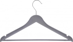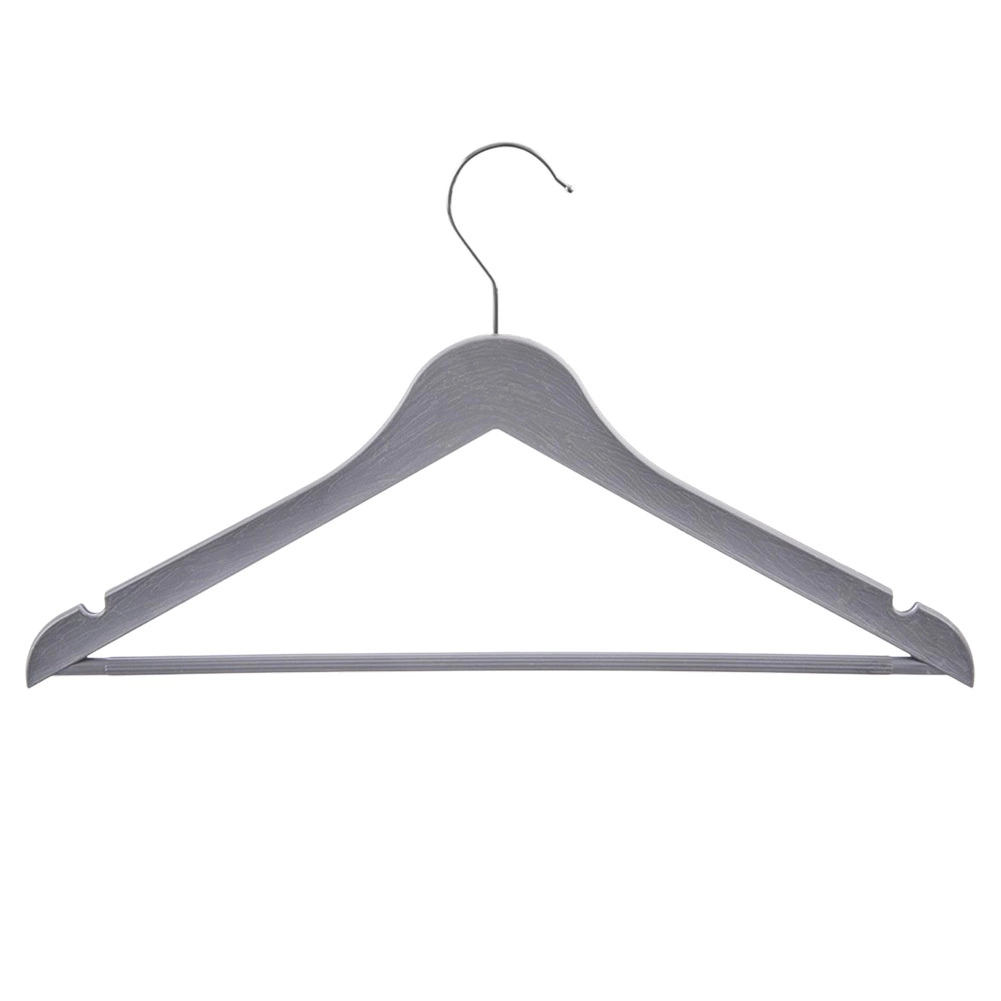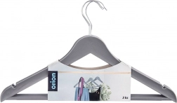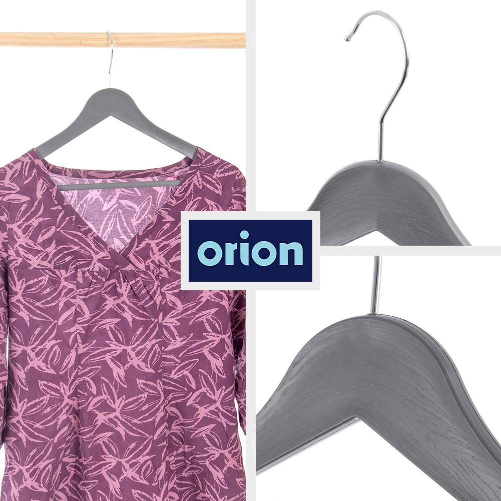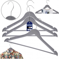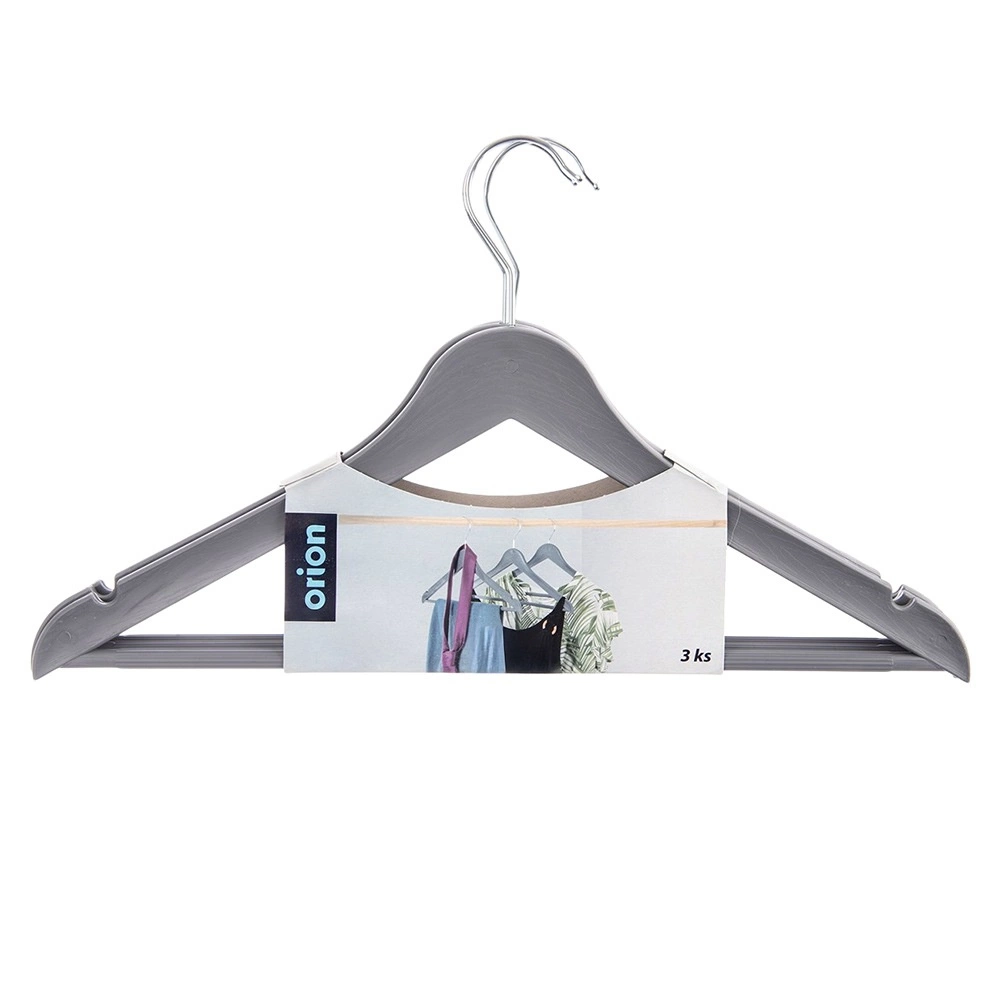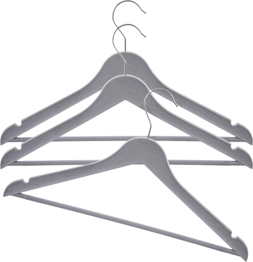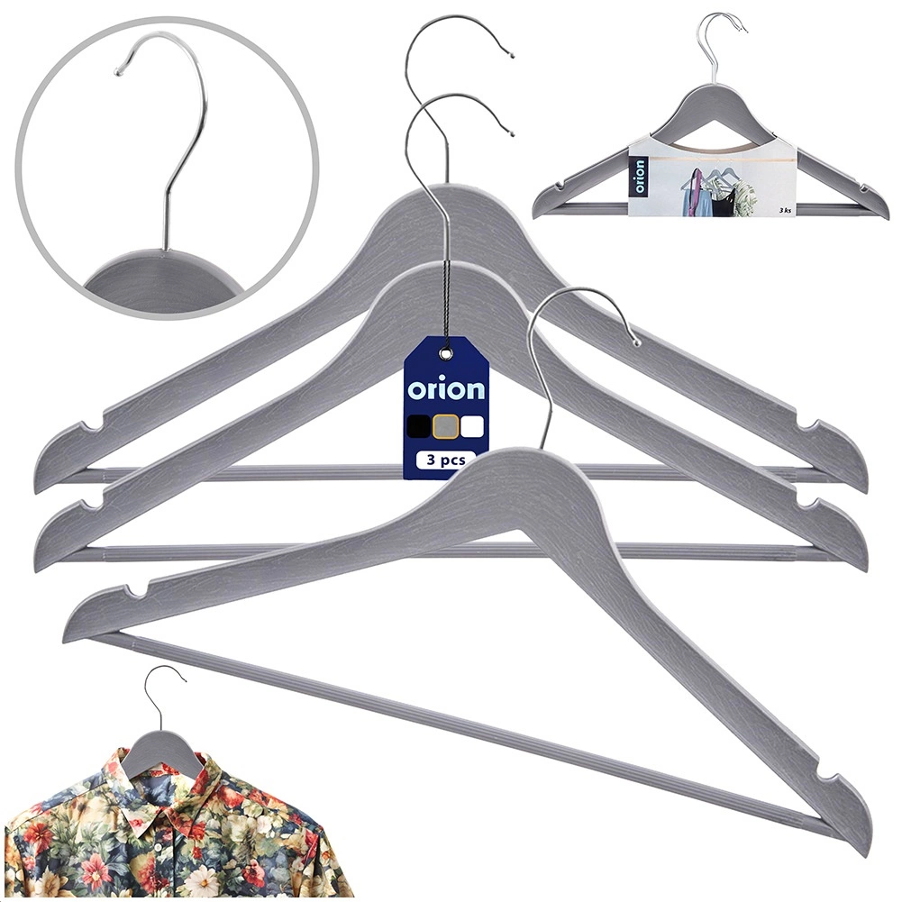 Praktyczny zestaw trzech szarych wieszaków z obrotowym hakiem do przejrzystego przechowywania ubrań w szafie i w sklepie. Wieszak ma uniwersalne zastosowanie, antypoślizgowe nacięcia na ramionach oraz poziomy drążek na spodnie lub szale. Dzięki wytrzymałemu wykonaniu i eleganckiemu wyglądowi imitującemu drewno utrzyma koszule, bluzki i cięższe płaszcze zawsze na swoim miejscu.