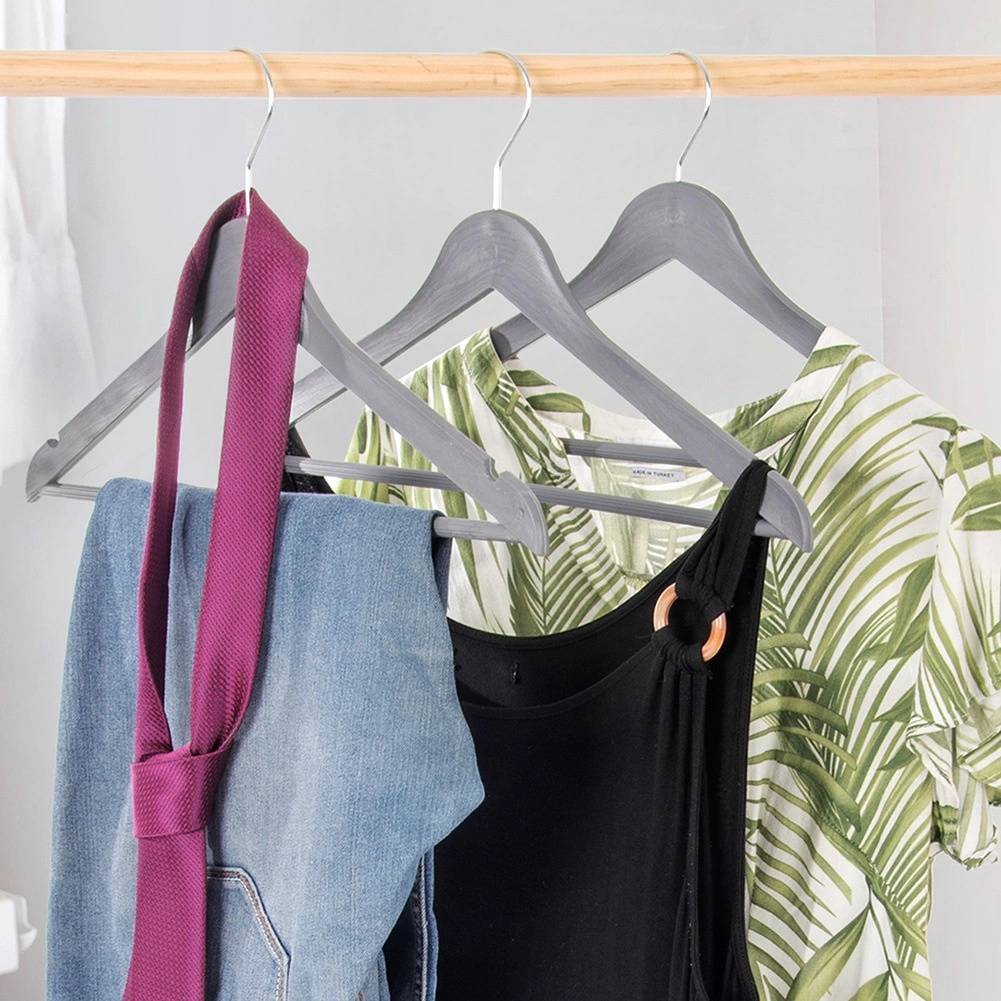 Zestaw 3 uniwersalnych wieszaków w nowoczesnym szarym kolorze pomoże utrzymać szafę perfekcyjnie uporządkowaną. Powierzchnia z dekorem drewna oraz metalowy obrotowy hak w srebrnym kolorze zapewniają styl i funkcjonalność w jednym. Wieszak nadaje się do codziennego użytkowania w domu i w sklepach odzieżowych.