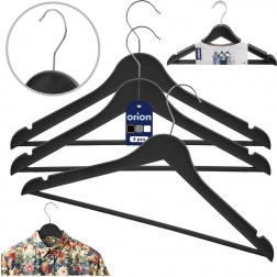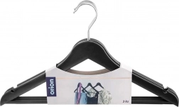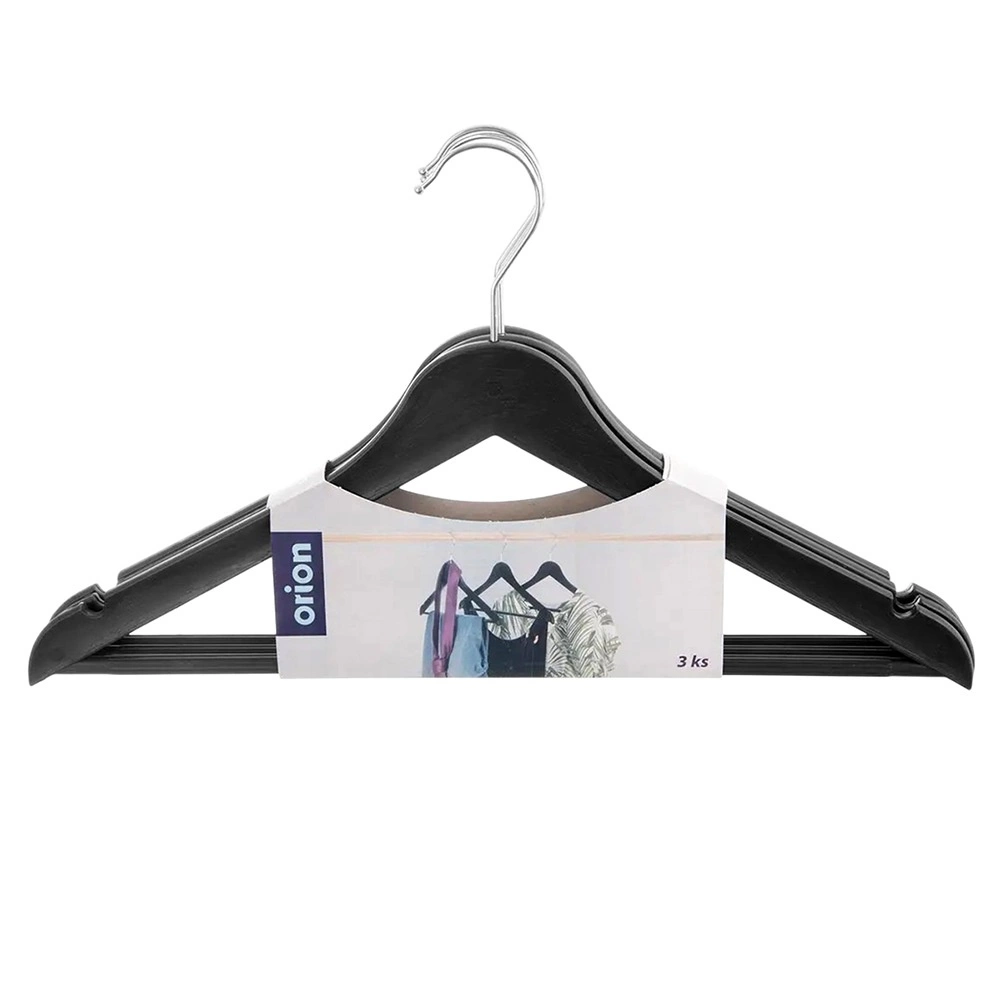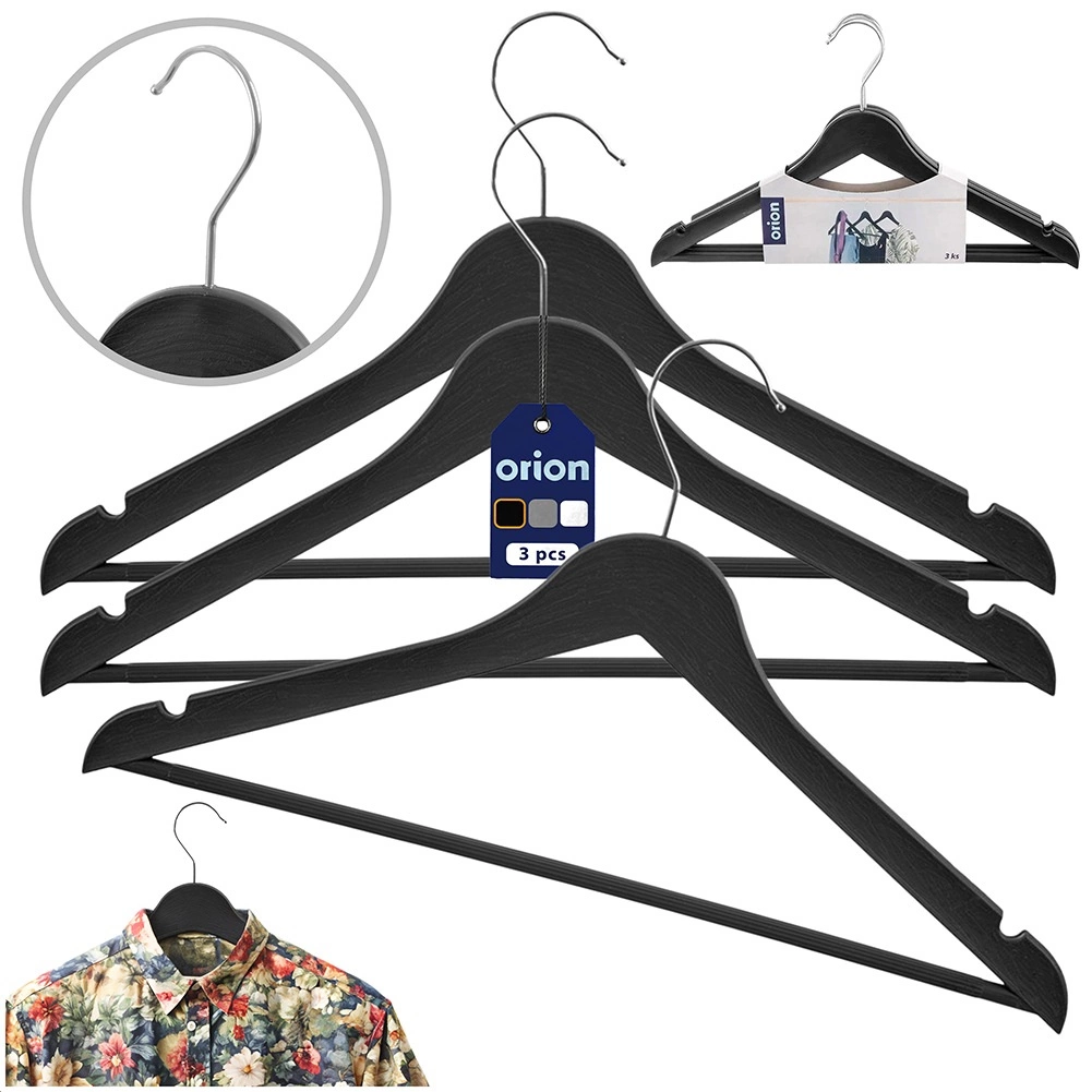 Praktyczny zestaw 3 czarnych wieszaków z obrotowym metalowym hakiem do perfekcyjnej organizacji garderoby. Wieszaki z dekorem imitującym drewno mają wycięcia na ramionach oraz dolną poprzeczkę na spodnie lub szale – idealne do T-shirtów, koszul, sukienek oraz cięższych płaszczy. Uniwersalne zastosowanie, stylowy wygląd i solidne wykonanie w jednym zestawie.