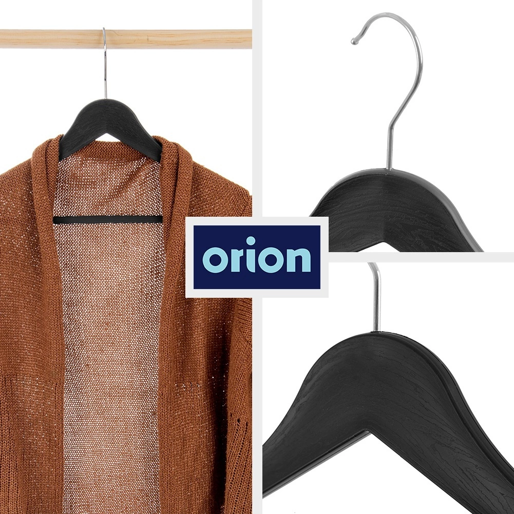 Utrzymuj garderobę przejrzystą i bez zagnieceń. Ten zestaw 3 czarnych wieszaków z realistyczną imitacją drewna oferuje ponadczasowy design i trwałe wykonanie. Obrotowy metalowy haczyk ułatwia wieszanie z dowolnego kierunku, a praktyczne wycięcia na ramionach pewnie trzymają topy na cienkich ramiączkach. Dolna poprzeczka nadaje się na spodnie, szale lub krawaty.