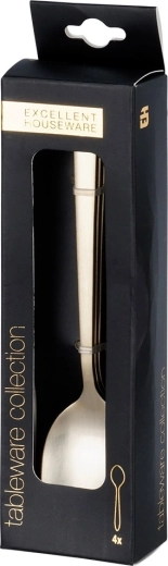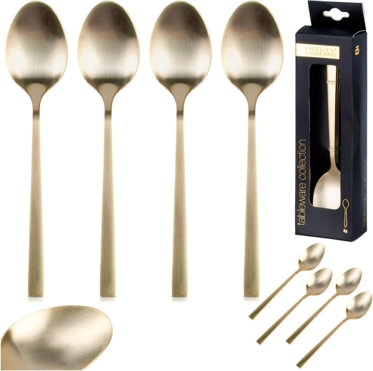 Dodaj odrobinę luksusu do swojego stołu dzięki zestawowi 4 łyżeczek do herbaty w satynowym, złotym kolorze. Nowoczesne, czyste linie i szczotkowana powierzchnia doskonale komponują się z klasycznym i nowoczesnym wystrojem domu oraz kawiarni. Trwała stal nierdzewna jest bezpieczna w kontakcie z żywnością i zapewnia długą żywotność.