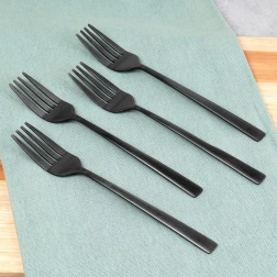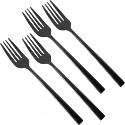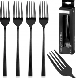 Elegancki zestaw czterech deserowych widelczyków w nowoczesnym matowym czarnym kolorze, wykonanych z wysokiej jakości stali nierdzewnej. Są bezpieczne w kontakcie z żywnością, nadają się do zmywarki i idealnie sprawdzą się do serwowania tortów, ciast i deserów w domu i w gastronomii.