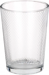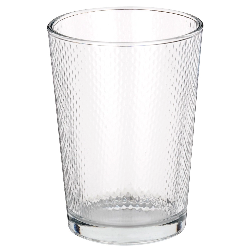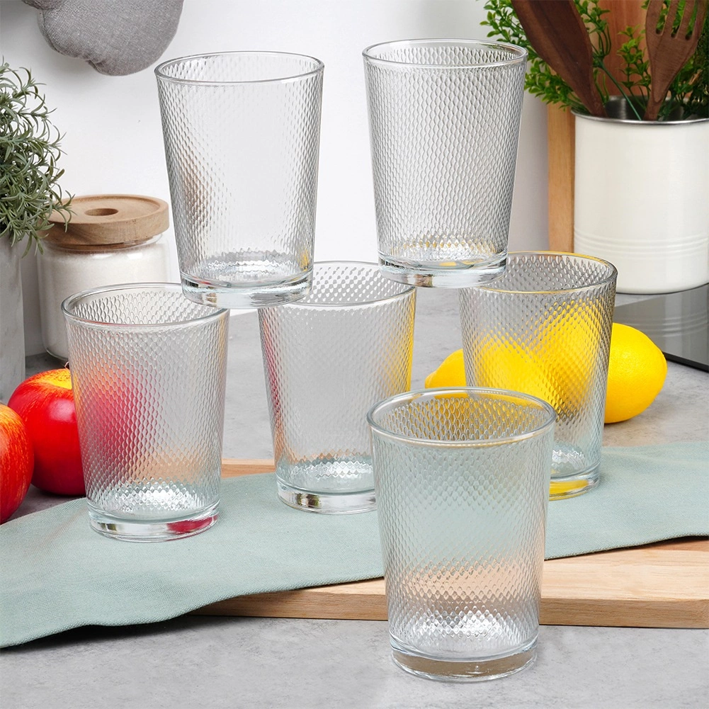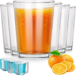 Elegancki zestaw sześciu szklanek o pojemności 425 ml z przezroczystego, grubego szkła ze strukturyzowaną powierzchnią dla pewnego uchwytu. Idealne na wodę, lemoniadę, soki i drinki, odpowiednie do zmywarki i świetne do codziennego użytku w domu i gastronomii.