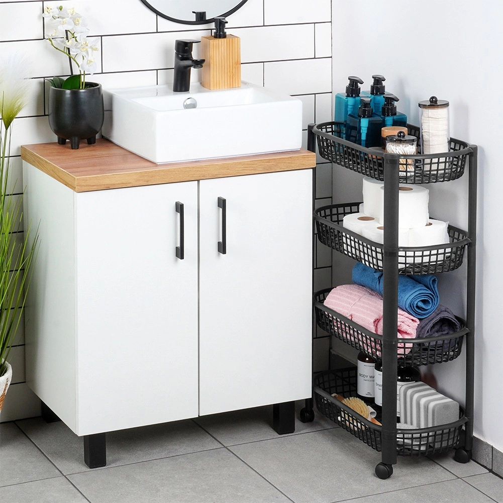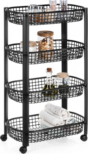 Cztery głębokie koszyki oferują dużo miejsca, a wąska podstawa oszczędza każdy centymetr podłogi – idealny do kuchni, łazienek i schowków.
