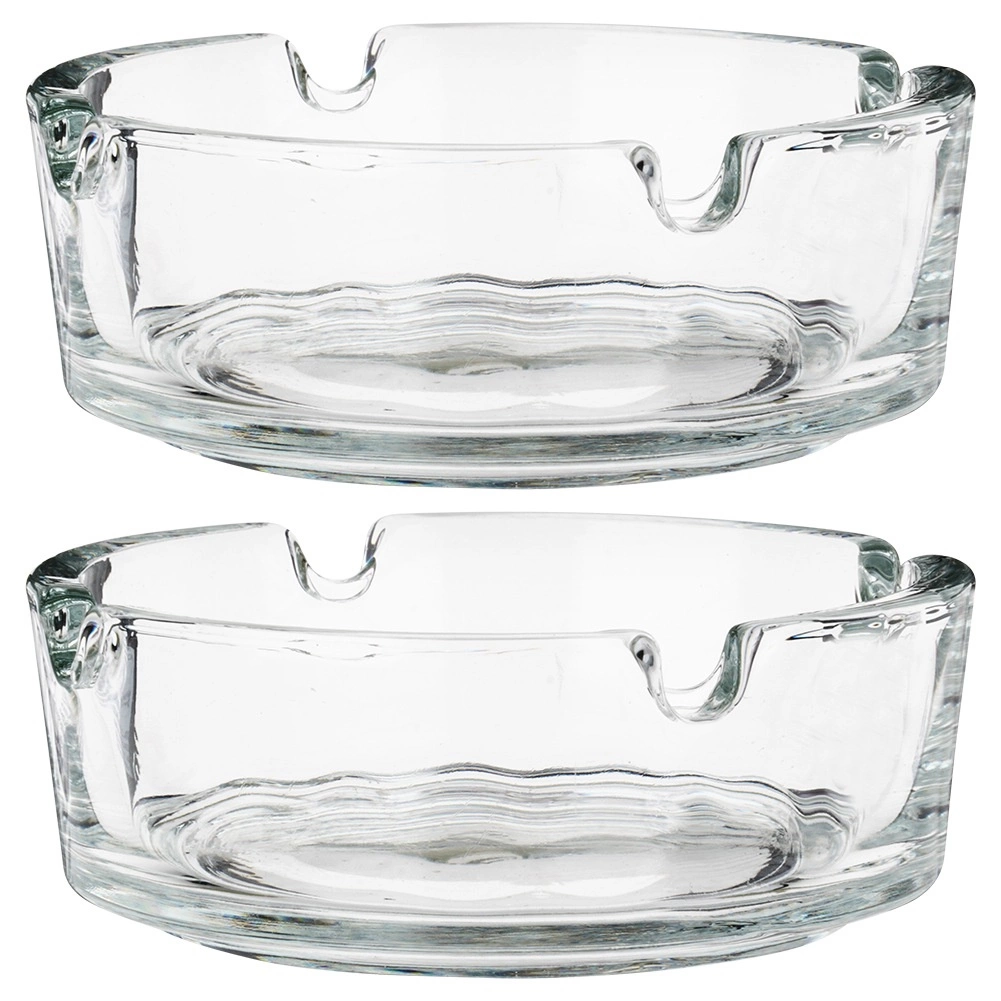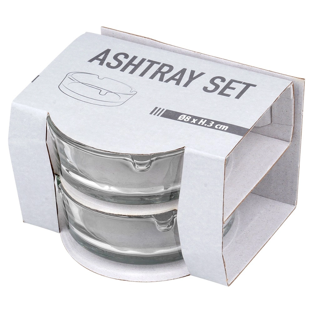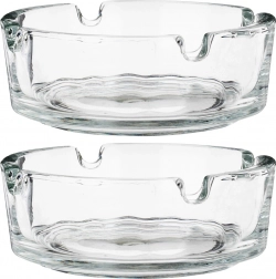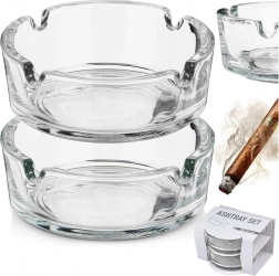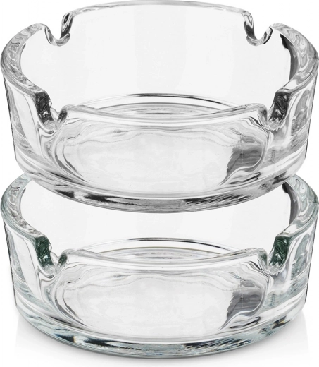 Praktyczny zestaw dwóch szklanych popielniczek o średnicy 8 cm i wysokości 3 cm do codziennego użytku w domu i na zewnątrz. Dzięki kompaktowym wymiarom, wytrzymałemu, grubemu szkłu oraz klasycznemu designowi sprawdzą się na balkonie, tarasie, w ogrodzie, a także w restauracjach, barach i hotelach. Każda popielniczka ma 4 nacięcia do wygodnego odkładania papierosa i jest łatwa w czyszczeniu.