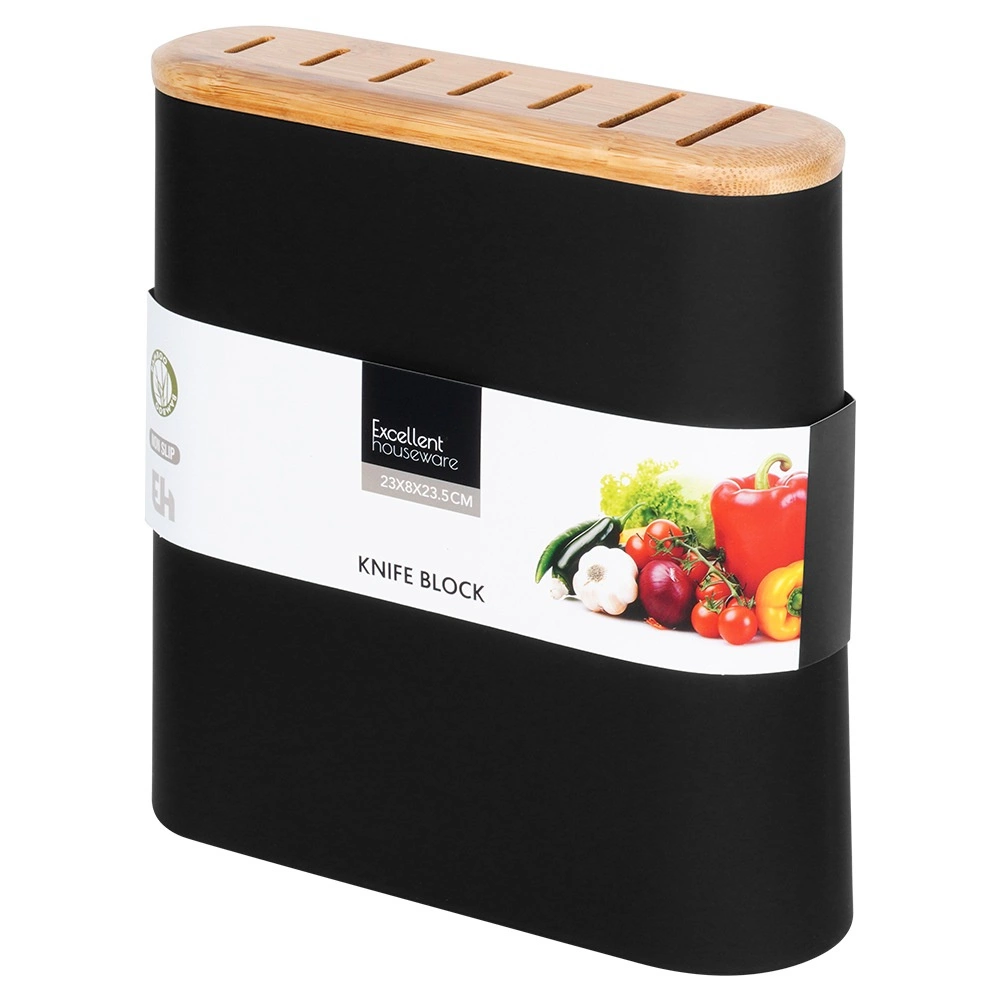 Stylowy i funkcjonalny stojak na noże o wymiarach 23 × 8 × 23,5 cm zapewnia przejrzyste, bezpieczne i higieniczne przechowywanie noży – stalowych, ceramicznych oraz mieszanych. Matowy czarny korpus z przyjemną powłoką soft touch oraz górna część z bambusa ze slotami tworzą ponadczasowy dodatek do każdej kuchni.