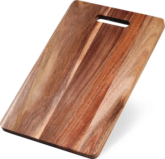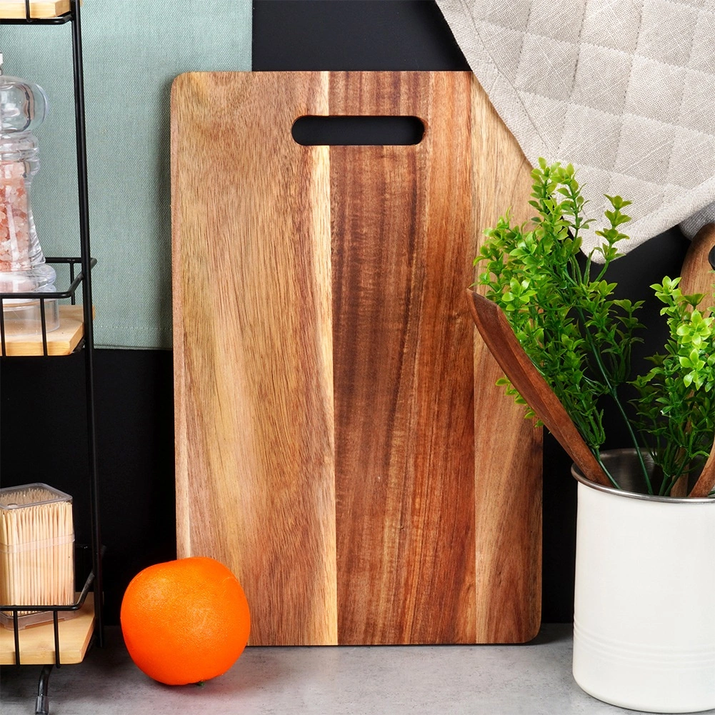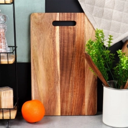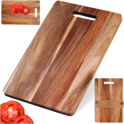 Odkryj solidną deskę z naturalnego drewna akacjowego, która zachwyca pięknym usłojeniem i wysoką trwałością. Dzięki mocnej konstrukcji i grubości 1,5 cm zapewnia stabilną i delikatną dla noży powierzchnię do krojenia, która chroni blat kuchenny przed uszkodzeniami. Powierzchnia jest łatwa w utrzymaniu, szybko schnie i nie pochłania zapachów.