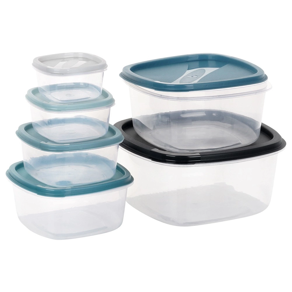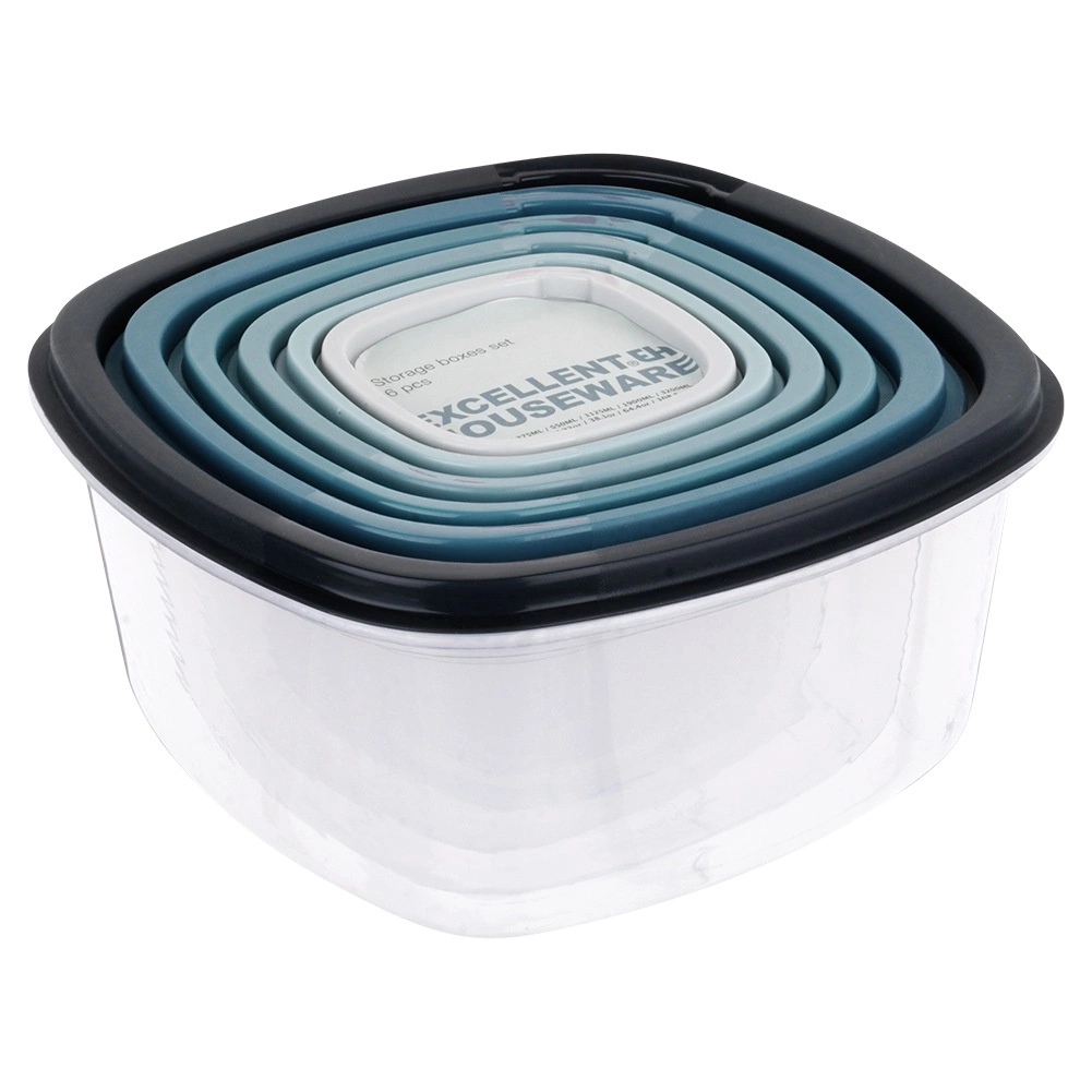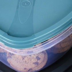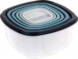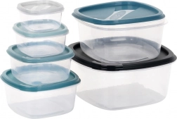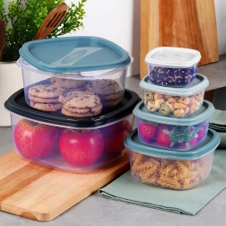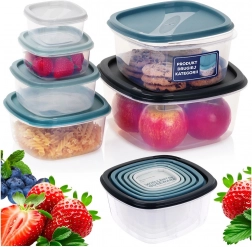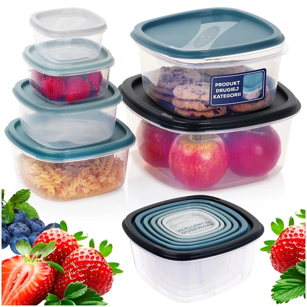 Praktyczny zestaw 6 przezroczystych pojemników na żywność z kolorowymi pokrywkami w odcieniach niebieskiego wprowadzi porządek do każdej kuchni. Dzięki różnym pojemnościom nadają się do produktów sypkich, owoców, przekąsek i gotowych dań. Pojemniki są piętrowalne i wkładane jeden w drugi, co oszczędza miejsce, mają uszczelniające pokrywki dla dłuższej świeżości i nadają się do lodówki, zamrażarki, mikrofalówki oraz zmywarki. Uwaga: outlet – w jednym pojemniku 1,9 l pokrywka nie pasuje idealnie.