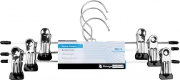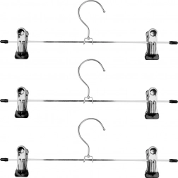 Zestaw 3 metalowych wieszaków z klipsami do przejrzystego przechowywania spodni, spódnic i innych ubrań. Regulowane przesuwne klipsy z gumowymi wkładkami pewnie trzymają tkaninę bez uszkodzeń i oszczędzają miejsce w szafie. Trwałe wykonanie w eleganckim srebrnym kolorze.