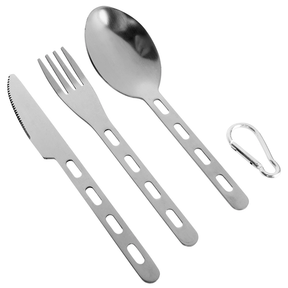 Pełnowymiarowa łyżka, widelec i nóż z ząbkowanym ostrzem do łatwego krojenia zapewnią komfortowe posiłki w każdym miejscu na zewnątrz.