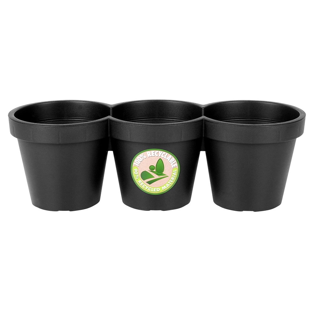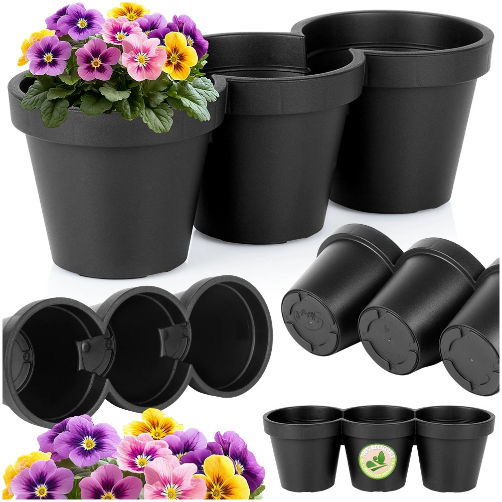 Ta praktyczna potrójna doniczka łączy trzy okrągłe pojemniki (każdy ok. 14,5 cm) w jeden kompaktowy element o długości 39,5 cm. Umożliwia uprawę kilku gatunków roślin w jednym miejscu, zachowując jednocześnie spójny i estetyczny wygląd nasadzeń.