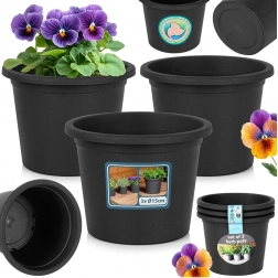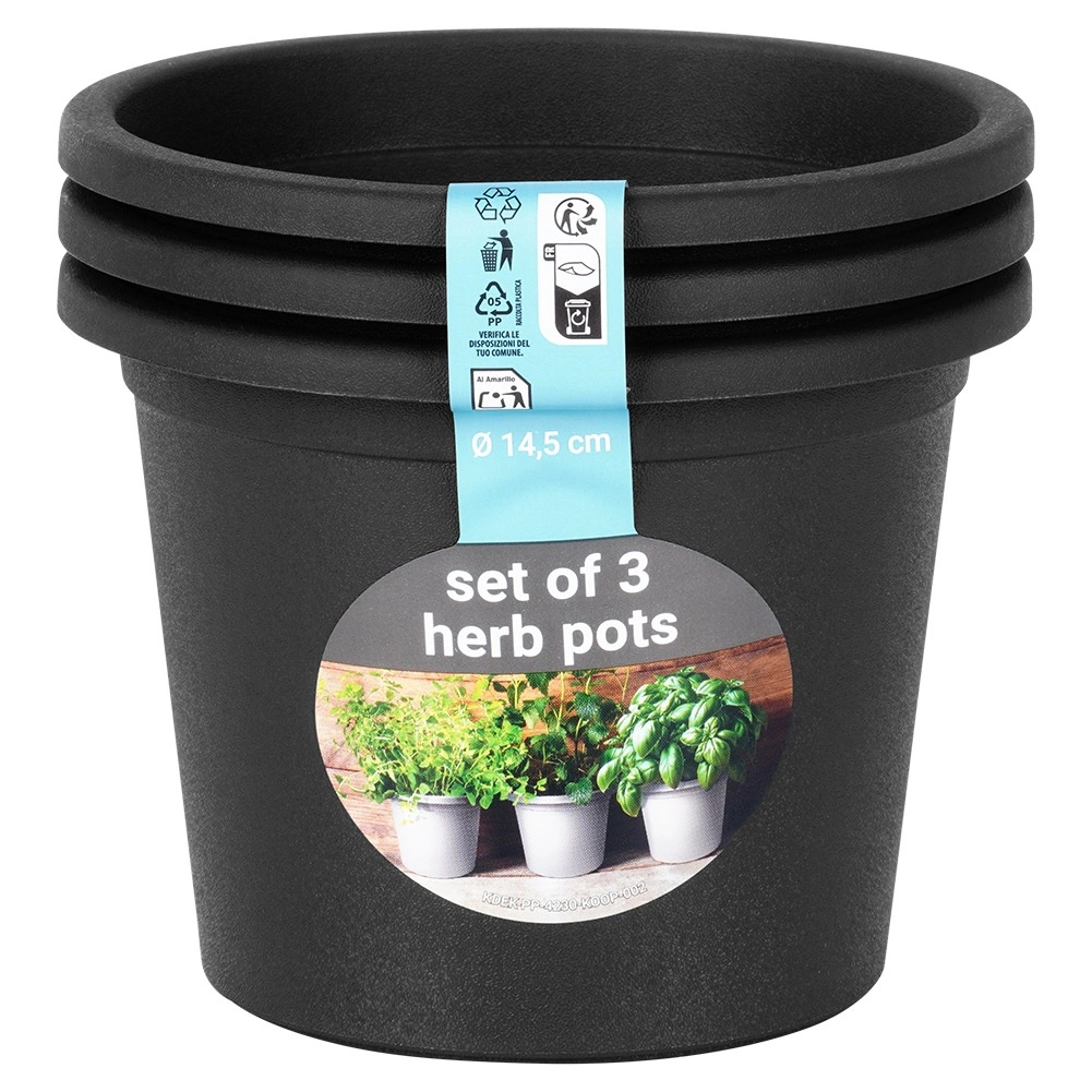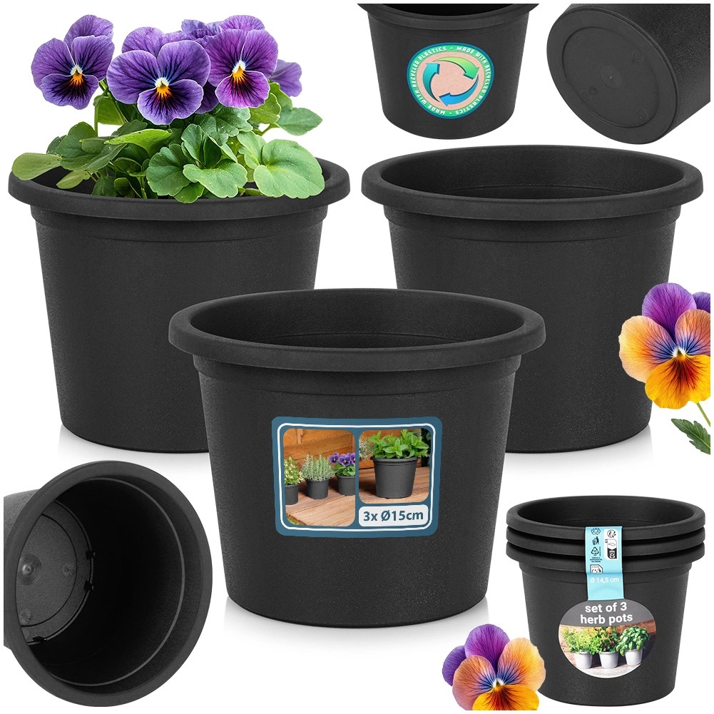 Praktyczny zestaw trzech czarnych doniczek o średnicy 14,5 cm do ziół i kwiatów, do wnętrz i na zewnątrz. Lekkie, wytrzymałe i z plastiku z recyklingu, o eleganckim, okrągłym kształcie i całorocznej odporności na warunki pogodowe – na balkon, taras, do ogrodu i domu.