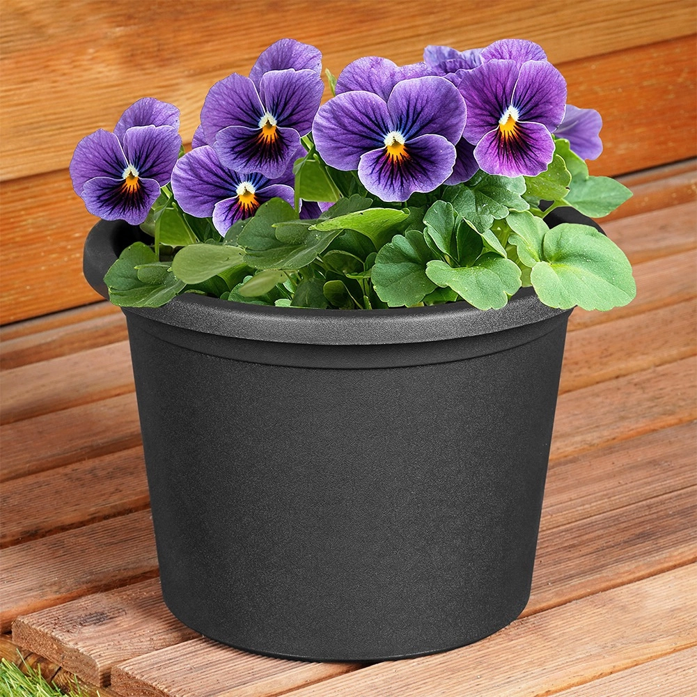 Klasyczny okrągły kształt i czarny kolor pasują na balkon, taras oraz do drzwi wejściowych. Rośliny pięknie się w niej prezentują.