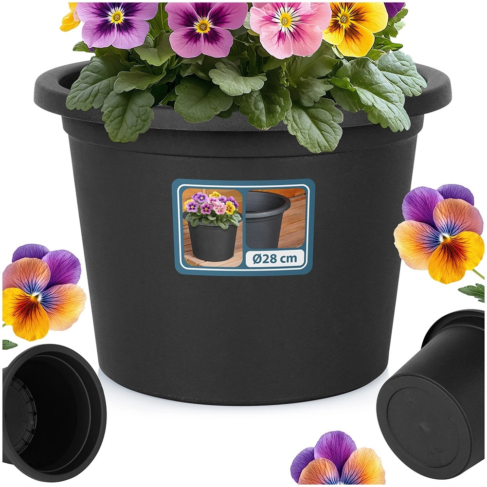Czarna okrągła donica o średnicy 27,5 cm i wysokości 19,5 cm to idealny wybór do całorocznego użytku na zewnątrz. Zapewnia wystarczająco dużo miejsca na wzrost roślin, a dzięki solidnemu brzegowi i zwężającym się ściankom wygląda elegancko i stabilnie. Nadaje się jako samodzielna donica oraz dekoracyjna osłonka na wkładane pojemniki.